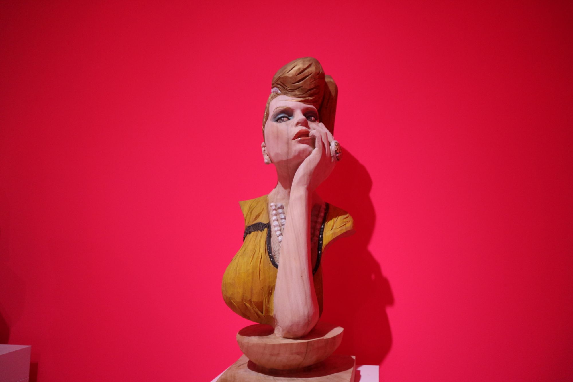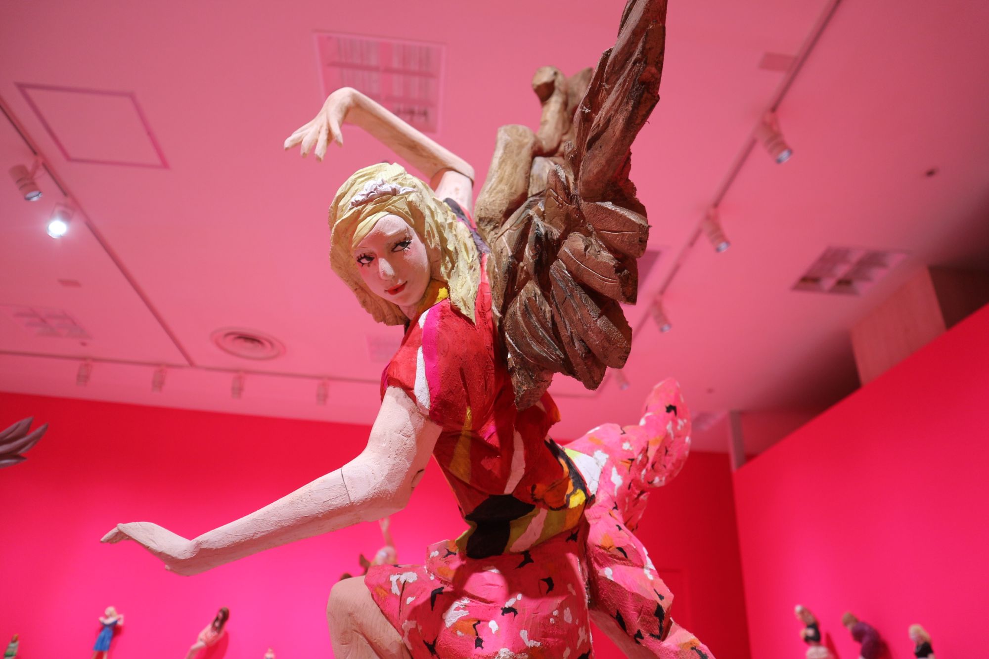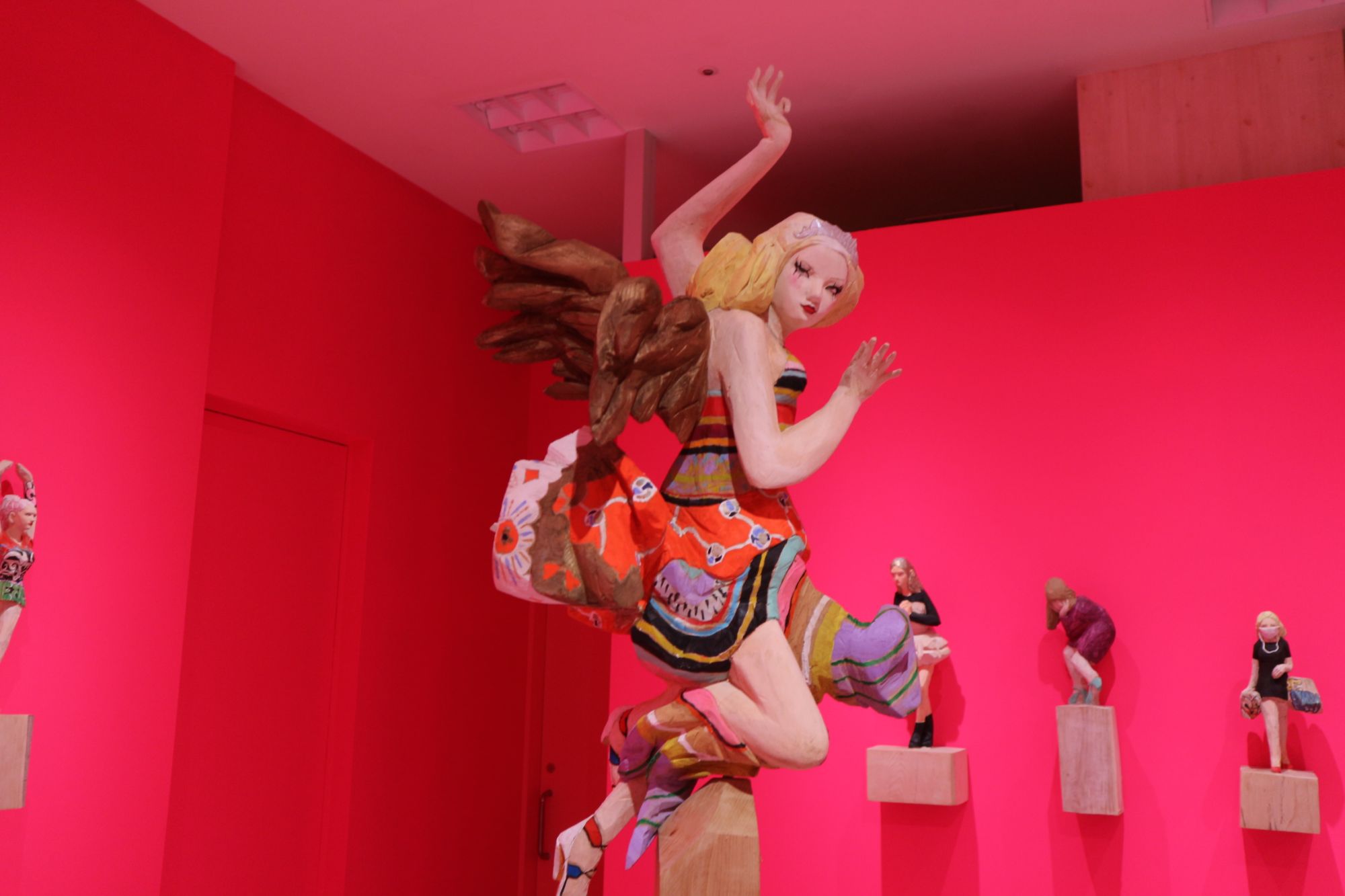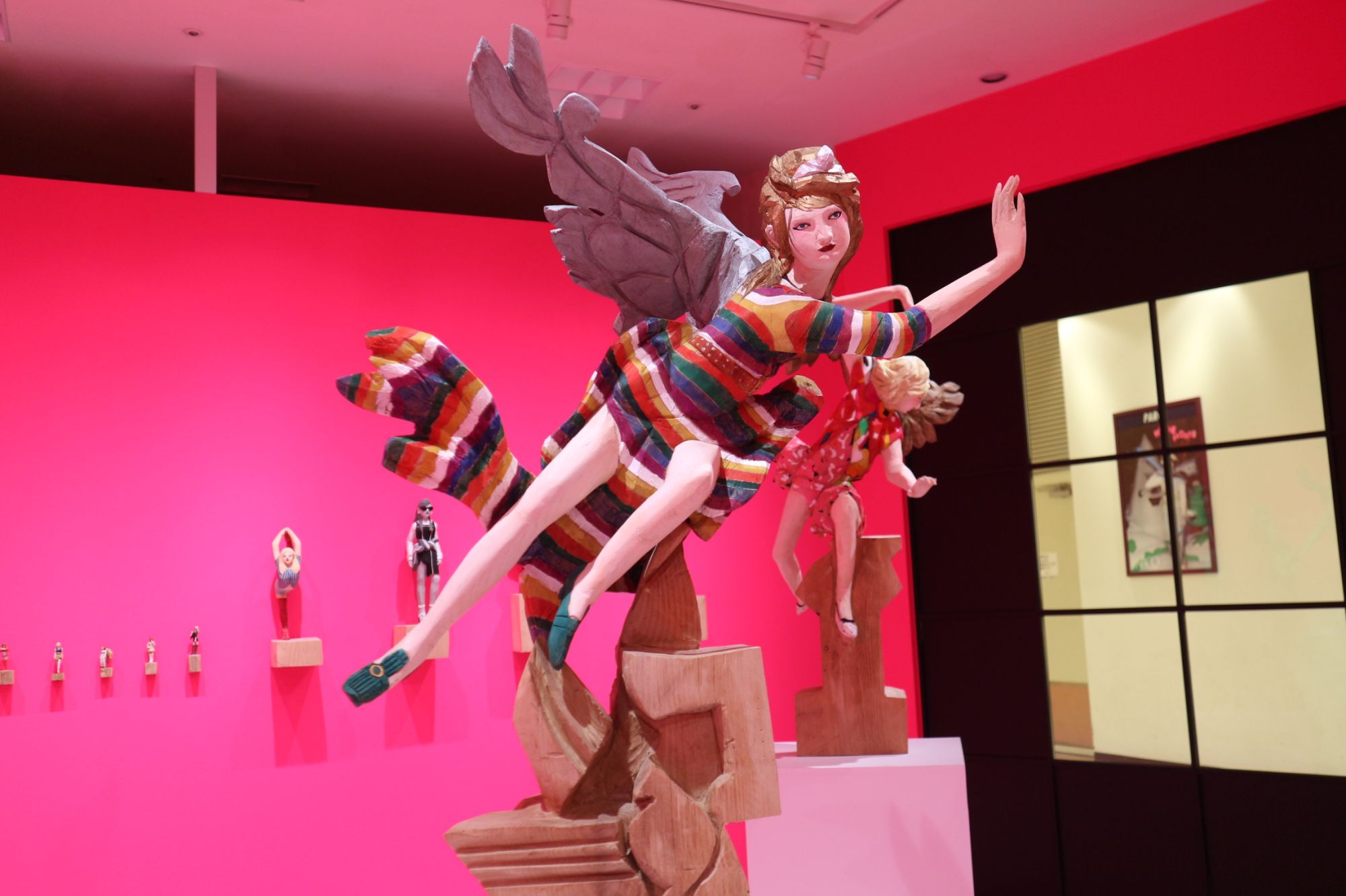 ピンクの壁紙の部屋に負けない迫力ある彫刻です。