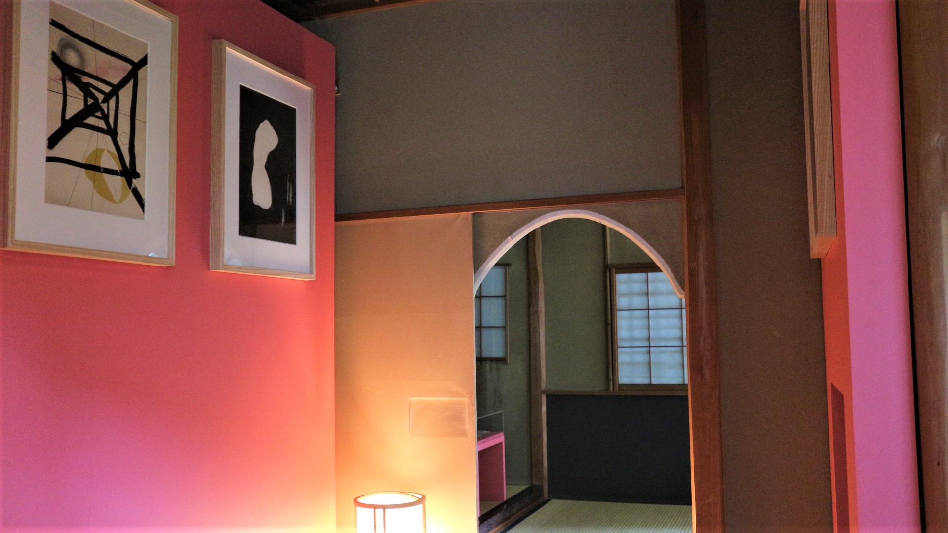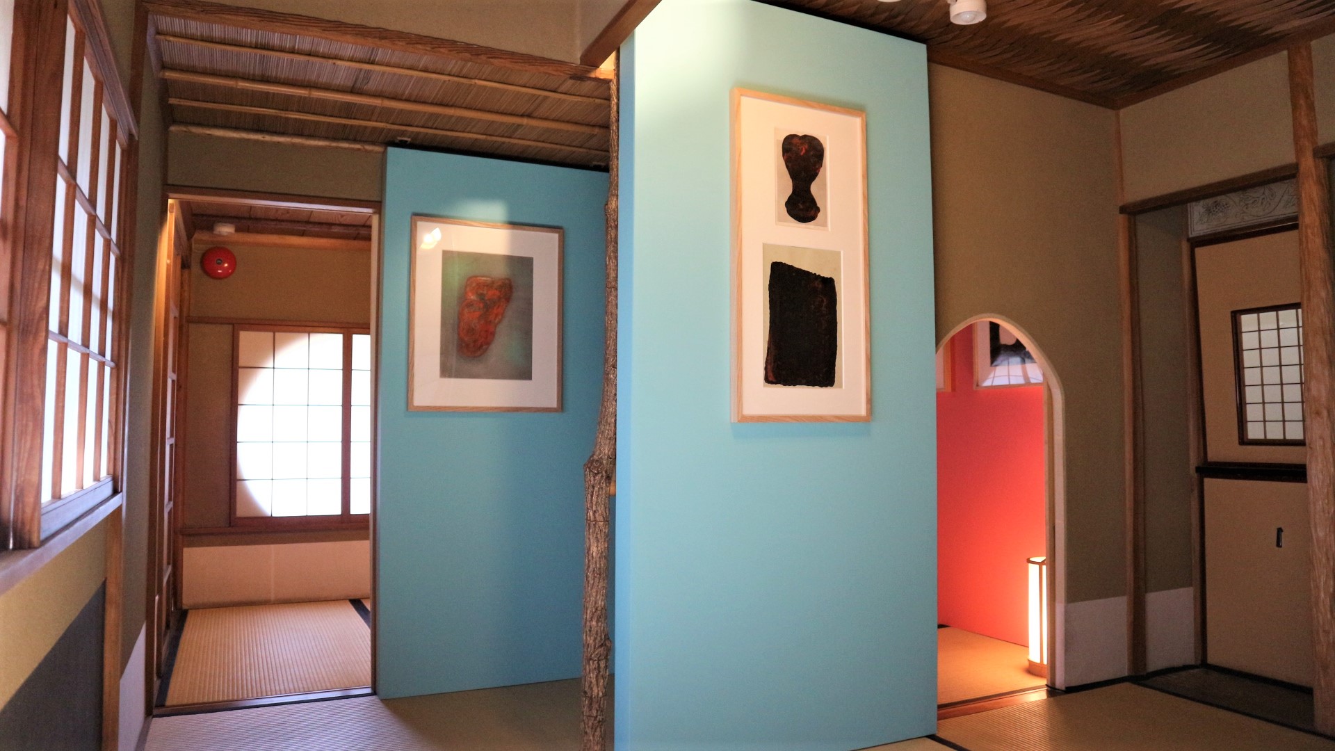 茶室に備えられた水色、ピンク色のボードに展示された作品は、和の空間と不思議にマッチしています。