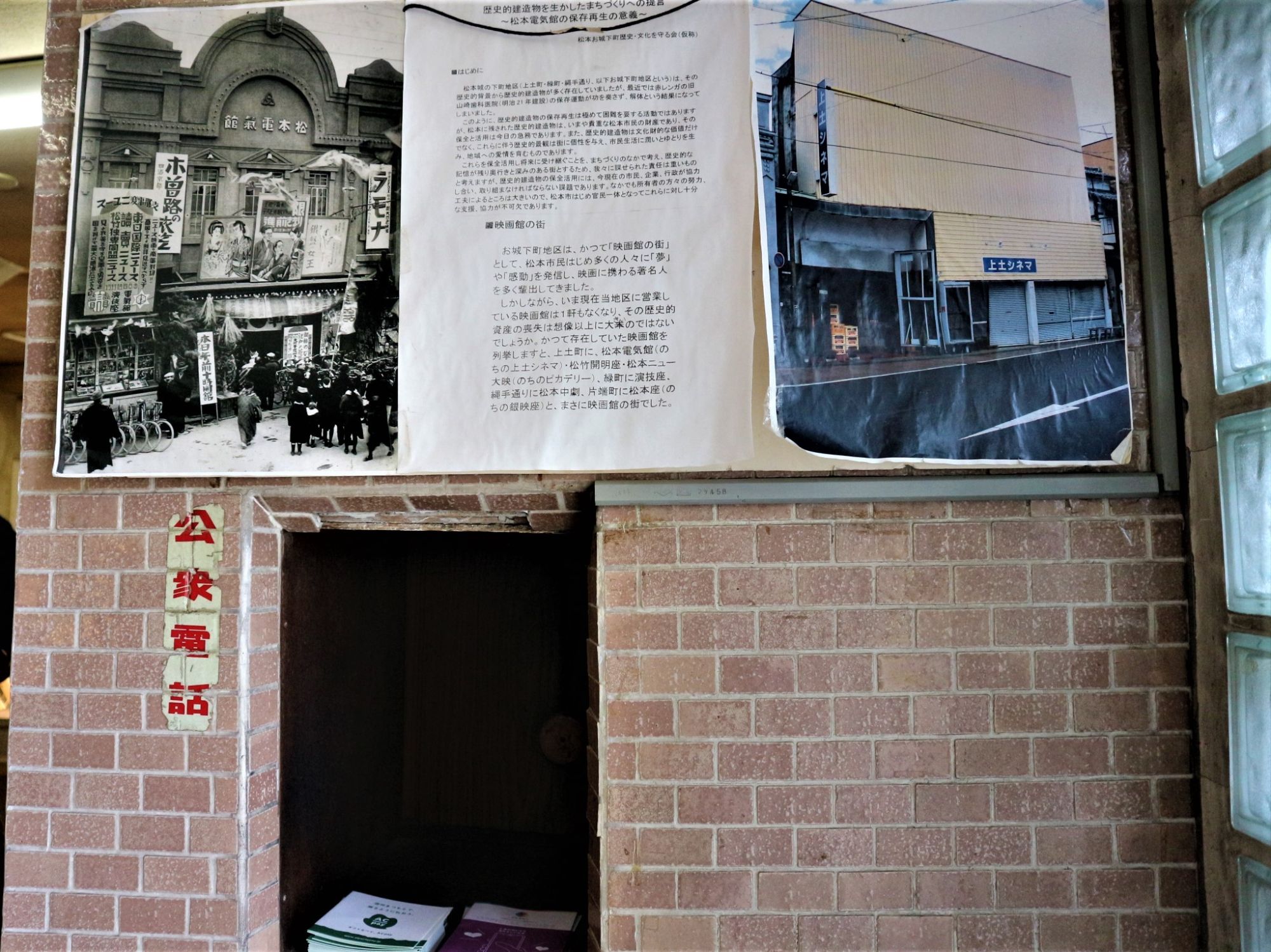 大正6(1917)年に『松本電気館』として開業した映画館。『オリオン座』、『松本東映』と改称し、この頃は仁侠映画で賑わったという。1階は昭和の一時期、改装してクラブを運営していたが、平成元(1989)年頃に再改装し映画ホールにした。平成14(2002)年、通りの名前をとって『上土シネマ』となった後も地元ファンの憩いの場として運営されてきたが、周辺環境の変化や建物の老朽化などにより閉館。平成20(2008)年に90年の幕を閉じた。