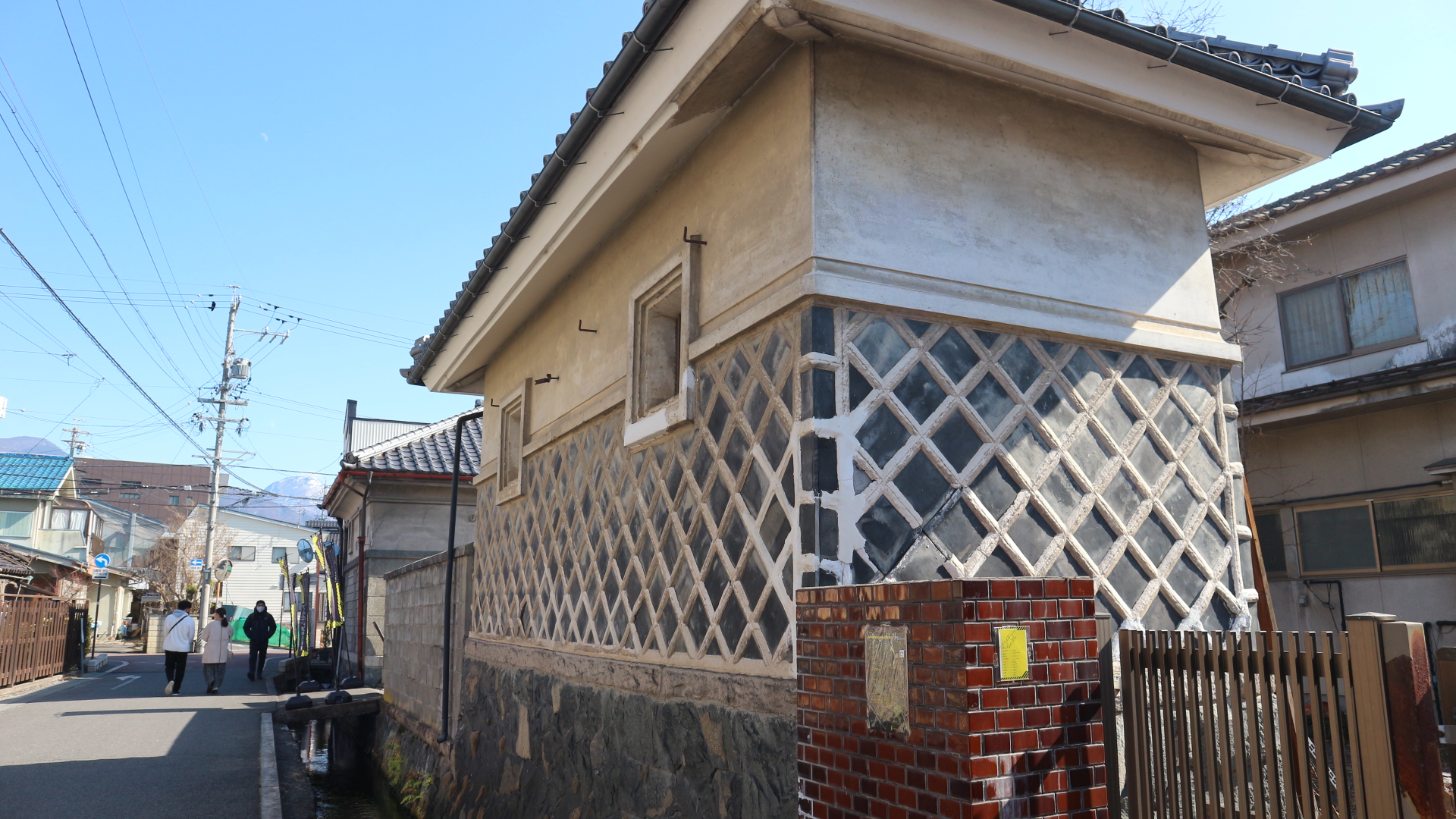 松本の城下町の外側に位置し、かつて庄屋を務めていた家の土蔵で、明治時代に米蔵として建てられたもの。北側には湧水が集まってできた蛇川が流れ、その石垣を兼ねた石積みに切り石を敷いて基礎にしている。基礎は高めに造られており、水害に備えて中には砂利が詰められたとされる。