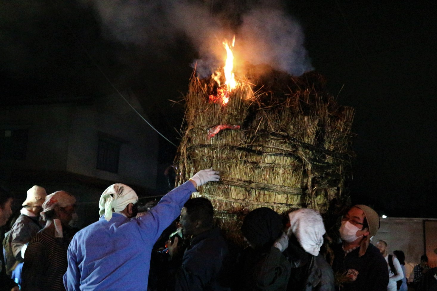 大小さまざまな松明に火をつけて担ぎ、温泉街を練り歩く姿はとても勇壮です。松明はおよそ50-60本ほど、大きな松明は直径3mにもなります。