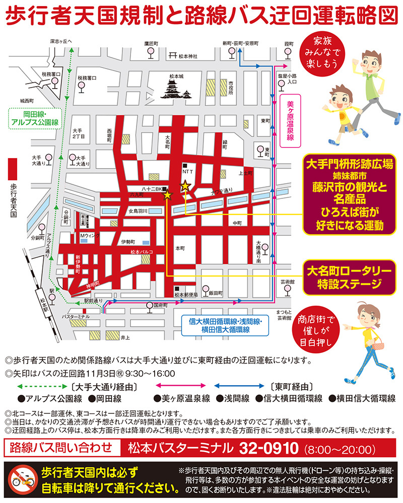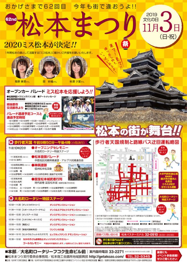 11月3日松本まつり「市民祭」に伴う交通規制のお知らせ 市街地 イベント 2019.10.31 ♥94 昨日10月30日の夕方 空が茜色に染まりました。 11月3日(日)は、松本市街地では「第62回松本まつり 市民祭」が開催されます。 市街地が大規模な交通規制が引かれ、様々なイベントが催されます。 国宝松本城では、「第63回 お城まつり」が開催され本丸庭園内で様々なイベントが開催されます。 街中の主要な道路、本町通、中町通り、大名町通りなどが歩行者天国になり とても賑わいます。 歩行者天国 午前9時50分~午後4時 昨年の市民祭の様子です。 Tweet