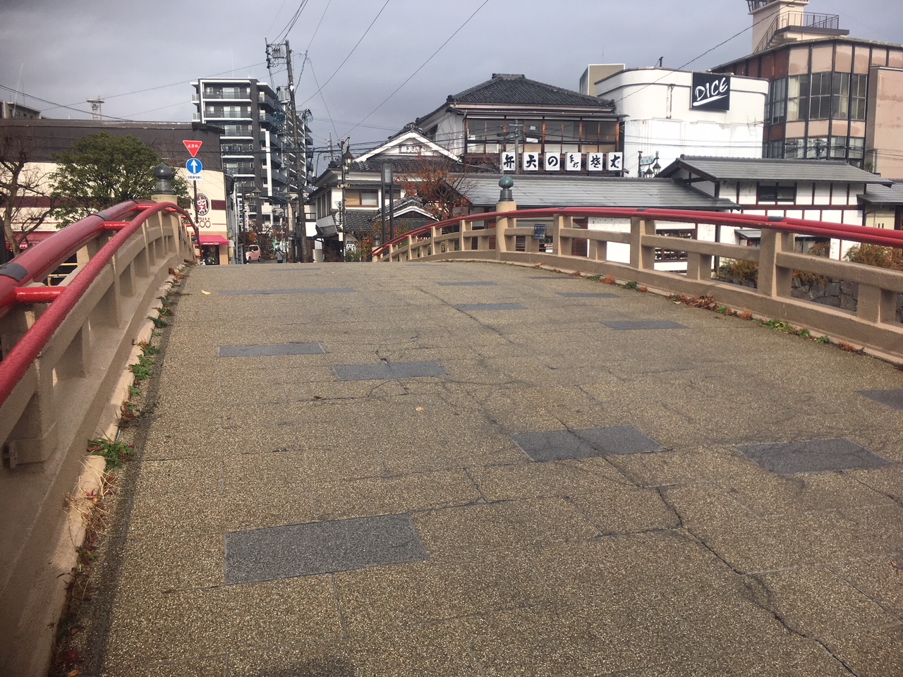 赤く塗られた太鼓橋「中の橋」を渡ると縄手通りに出ます。
