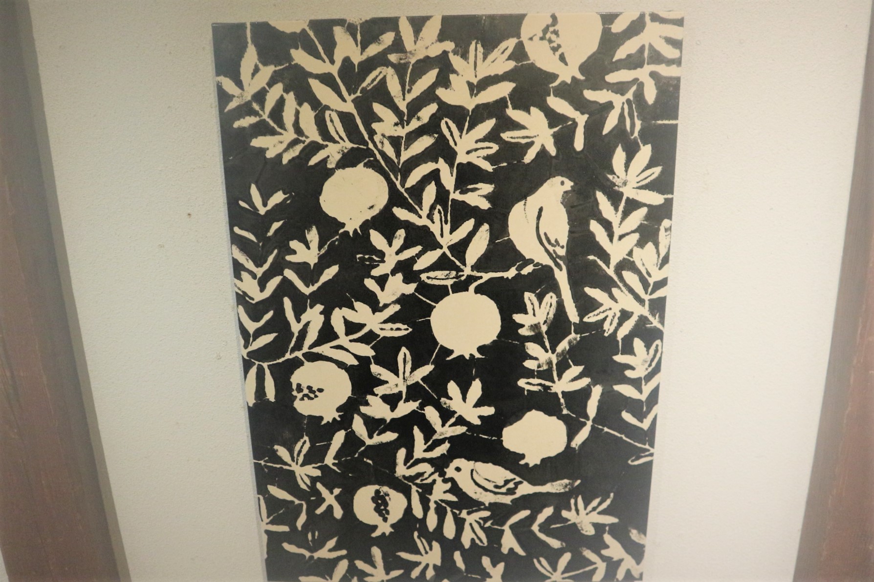左は「型染め用の型を作る際に生まれる副産物の、カシュ‐のしみた紙を貼ったパネルで、世界でたったひとつだけのものです。