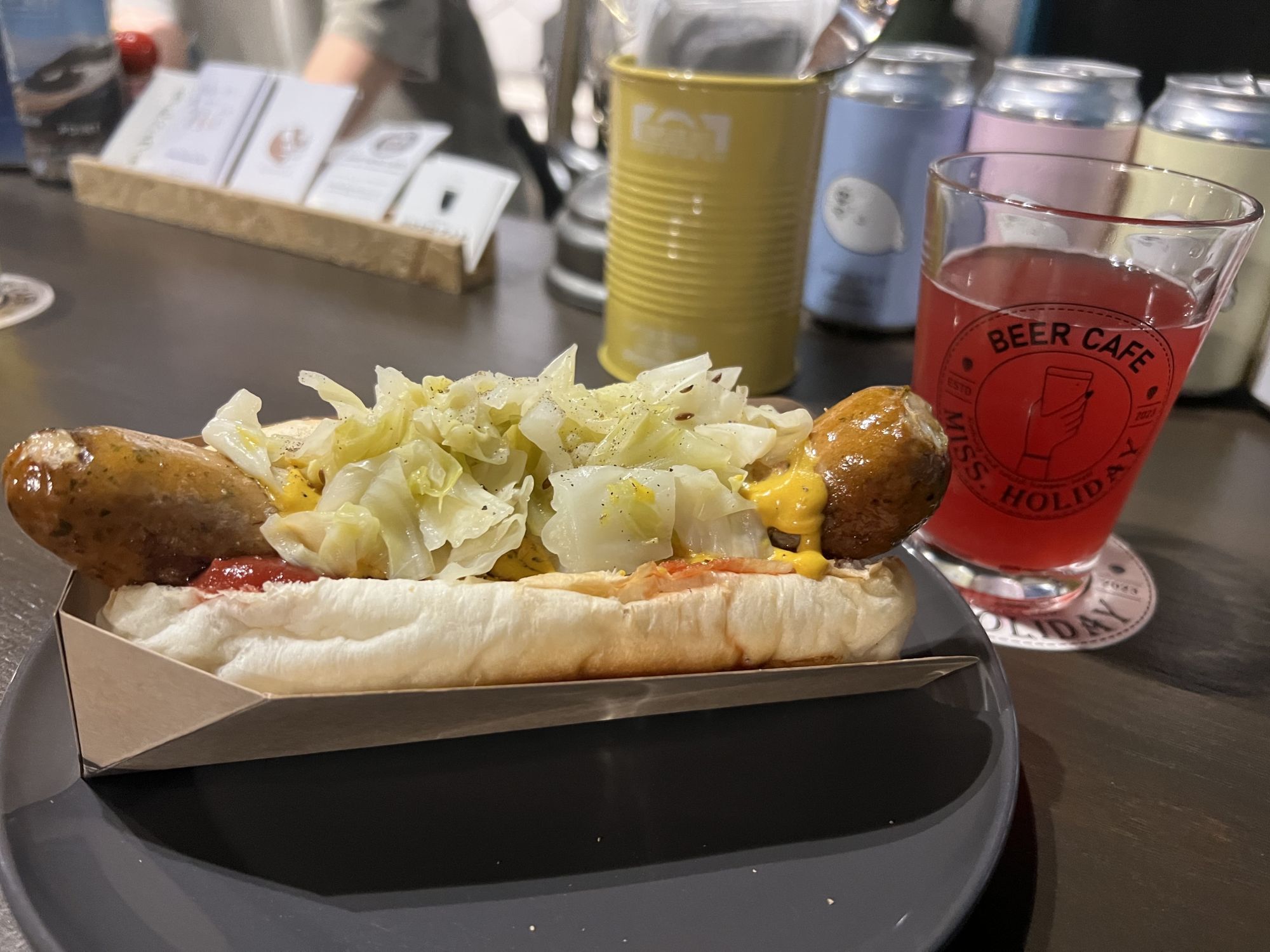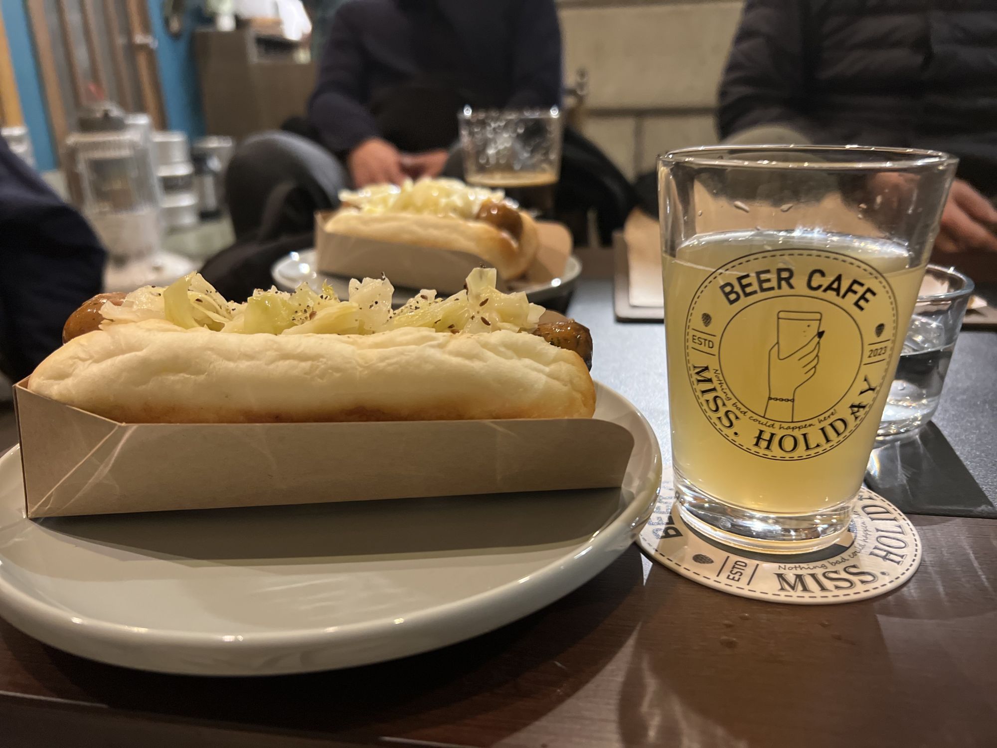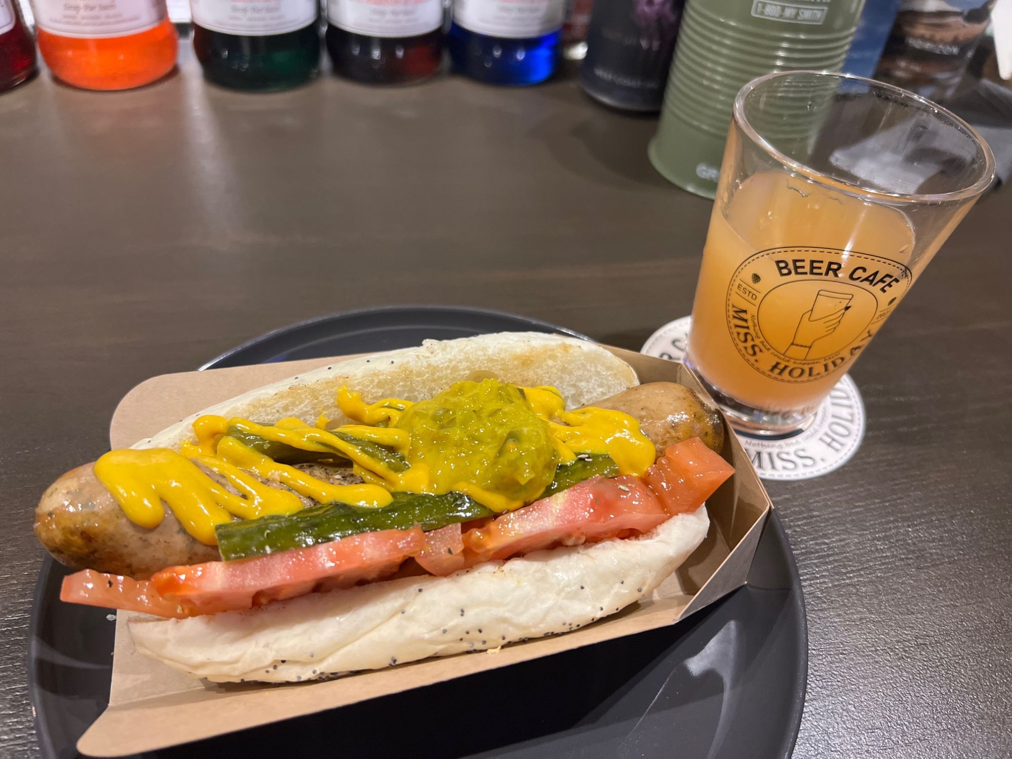 3種のフルーツ(ピーチ・カシス・オレンジ)を贅沢に使用した原価度外視の限定ビール。ホットドッグは、ニューヨークスタイル