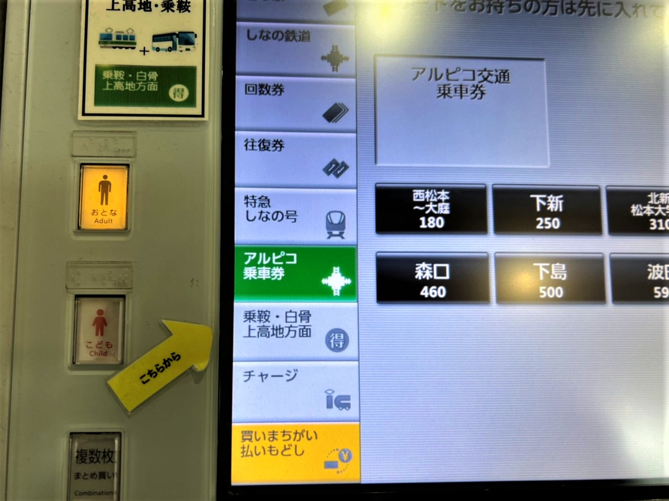 券売機は、向かって1番左端のアルピコ交通です。乗鞍・白骨上高地方面 🉐と書いてあるボタンを押します。片道大人2060円です。