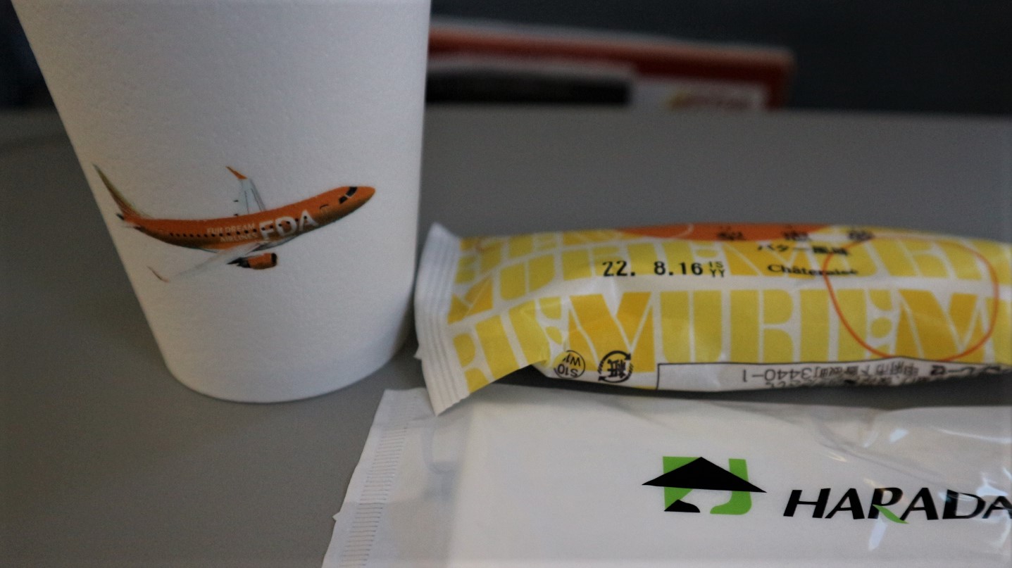 機内サービスは、シャトレーゼのお菓子とドリンク(お茶・コーヒー・りんごジュース)の中から1つ選べます。