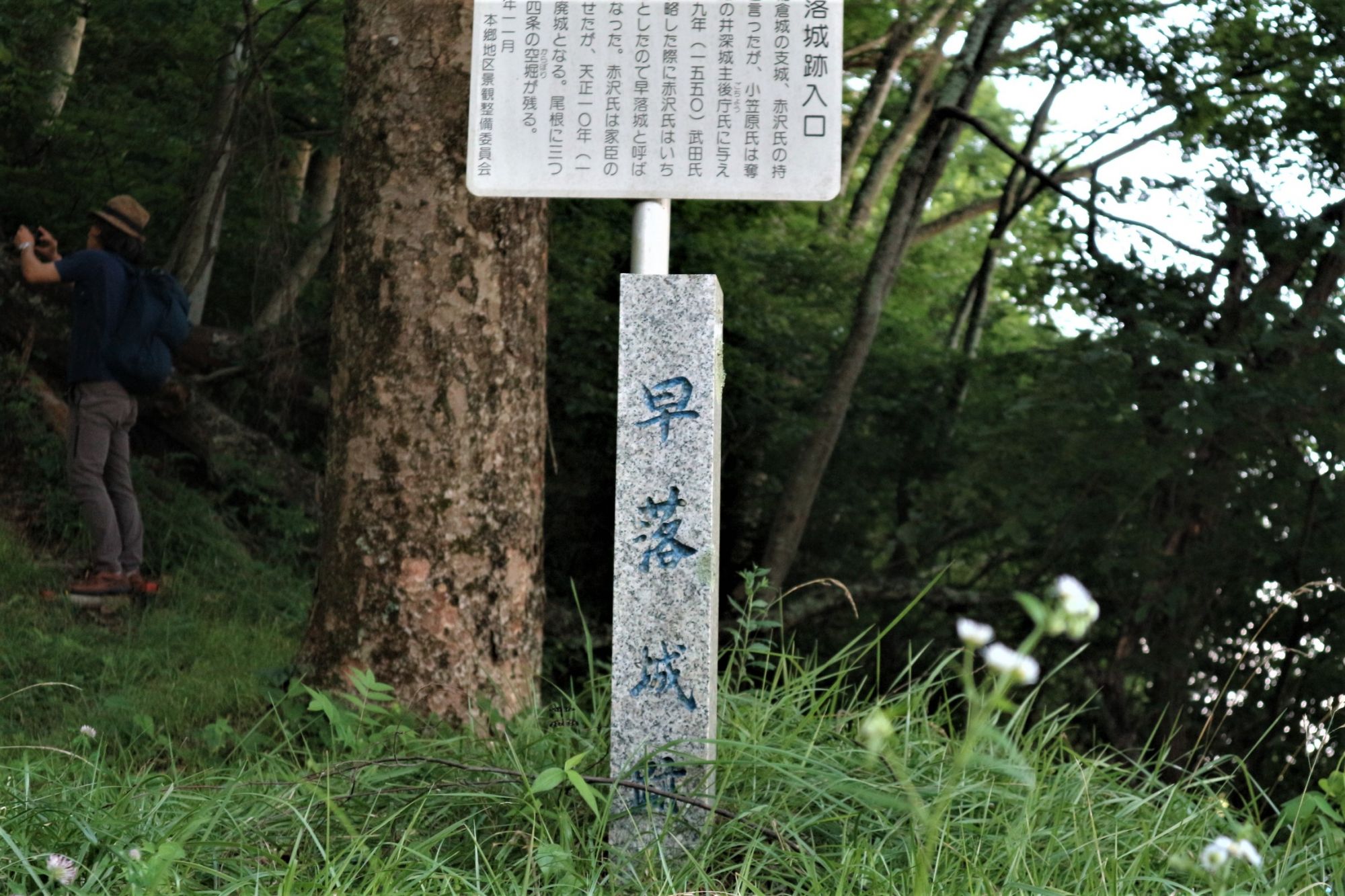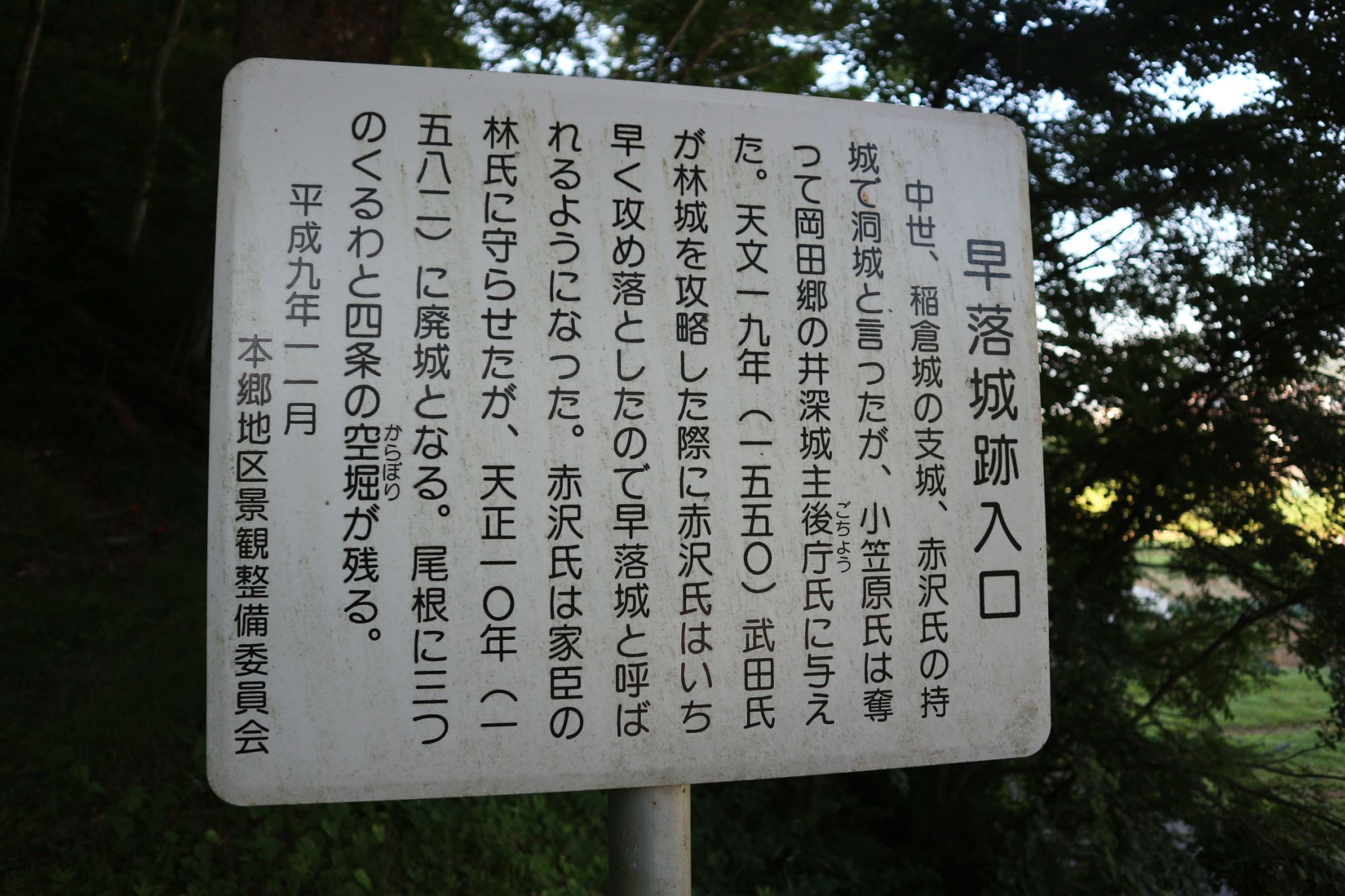 早落城は武田晴信(信玄)との戦において、なんともユニークな名前を背負ってしまった山城です。女鳥羽川沿いの南北に長い小山を利用した要害で、規模も小さく狭い尾根上に堀切と平場を連ねた質素な構えです。気軽に山城に登ってみたいという方におすすめです。(松本市文化財課HPより)