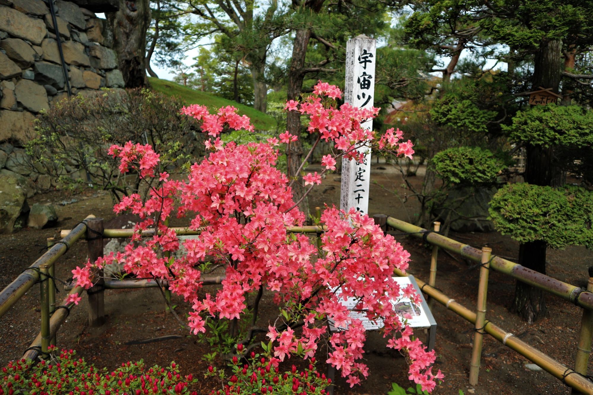 松本城を背景に、「自然は最良の師なり」をモットーに創作される「真派青山流」野外いけばな展