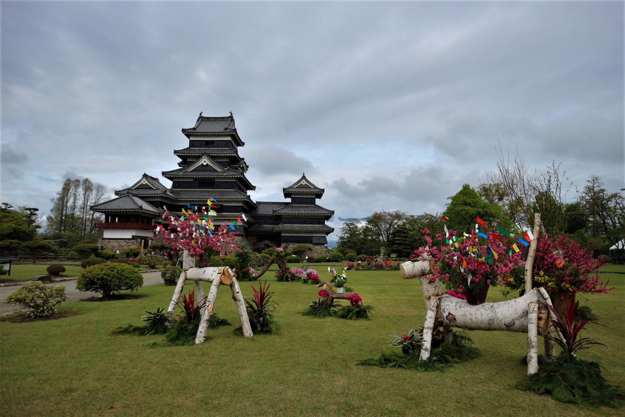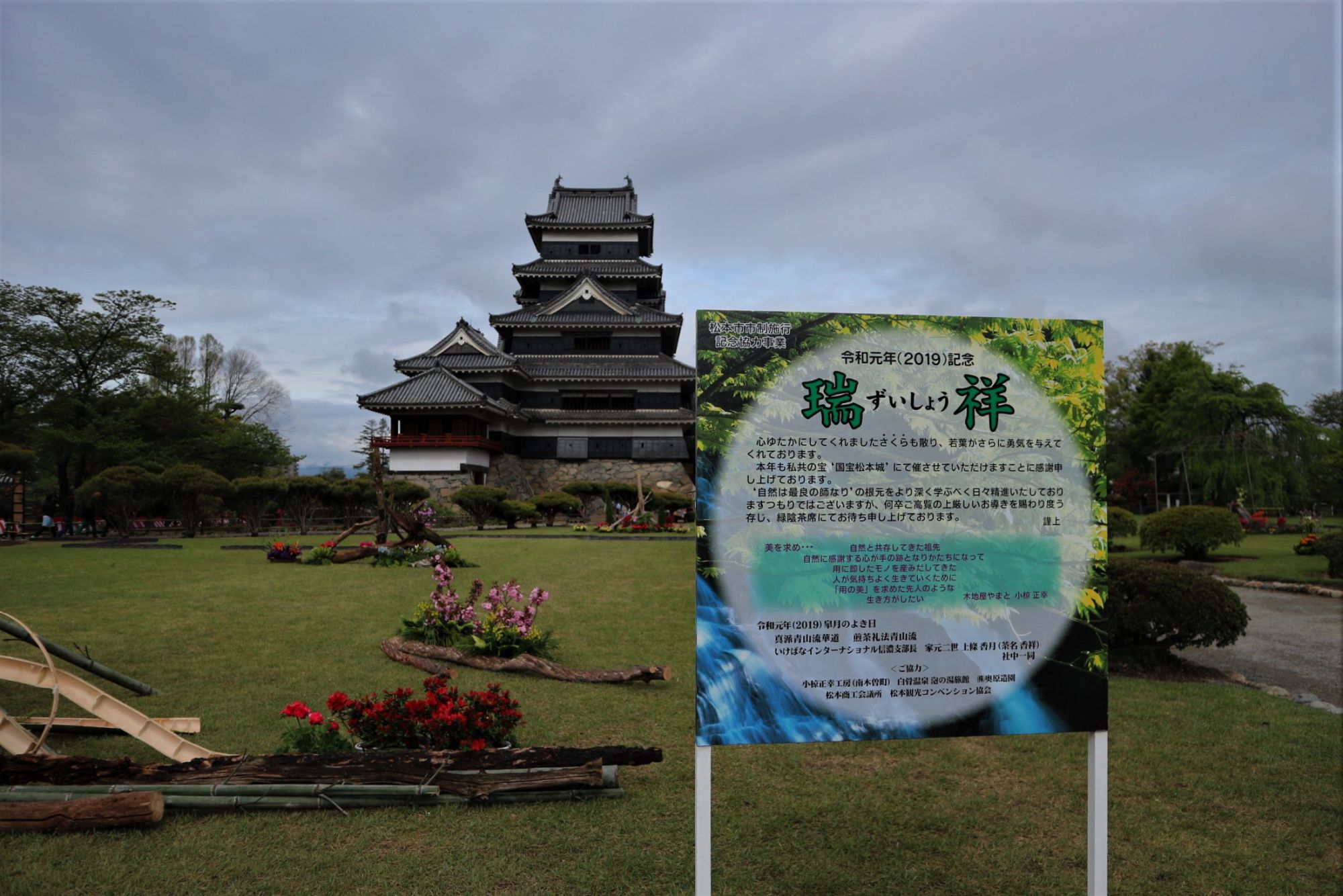 松本城を背景に、「自然は最良の師なり」をモットーに創作される「真派青山流」野外いけばな展