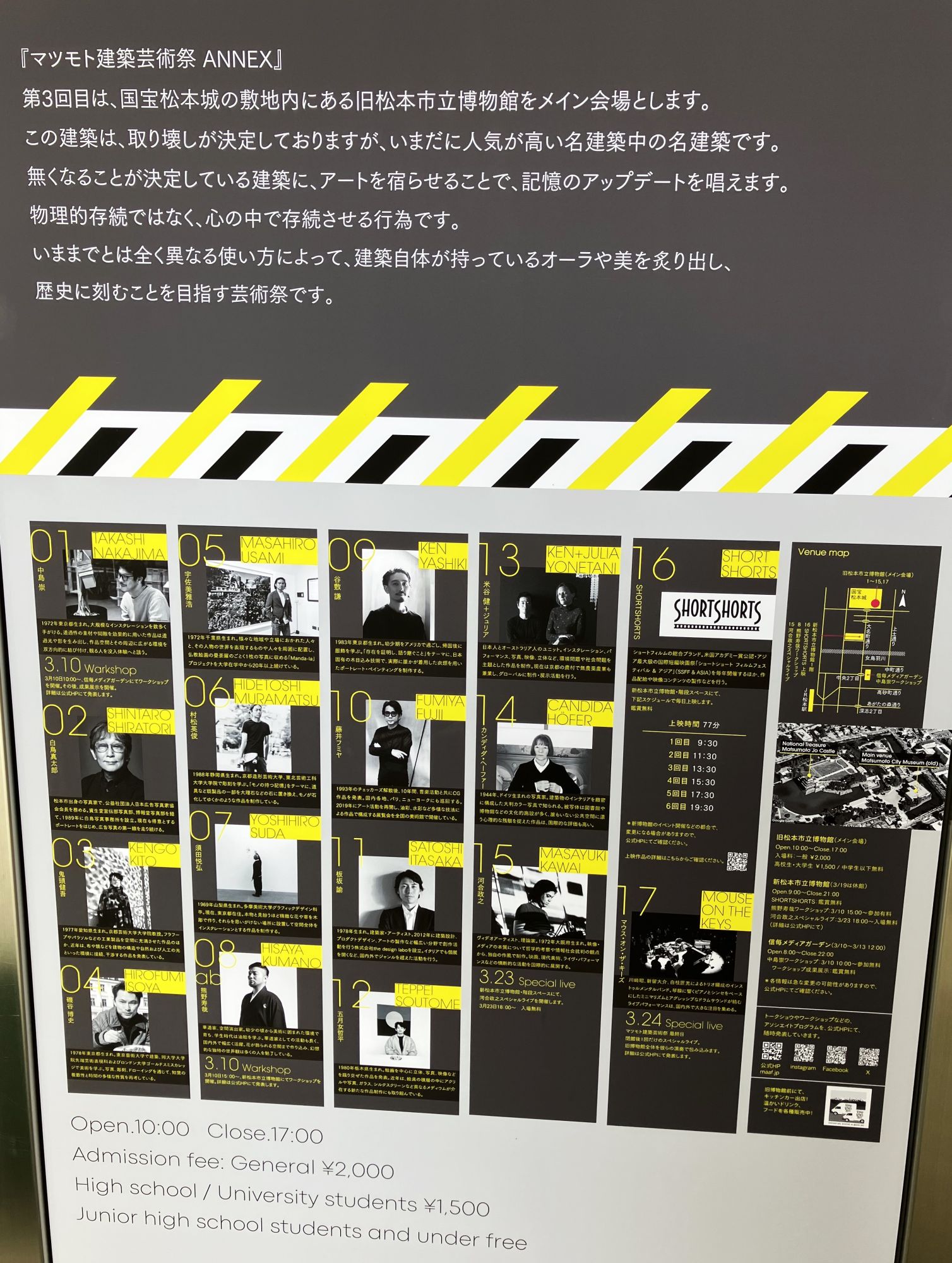 Das Besondere in diesem Jahr ist, dass der Hauptausstellungsort das ehemalige Matsumoto City Museum an der Burg Matsumoto ist. Es ist die letzte Veranstaltung, bevor das historische Gebäude abgerissen wird. Der Grund für den Abriss ist, dass das Gebäude auf dem Gelände der Burg Matsumoto steht und die Burg deshalb nicht als UNESCO Kulturerbe zugelassen werden kann.
