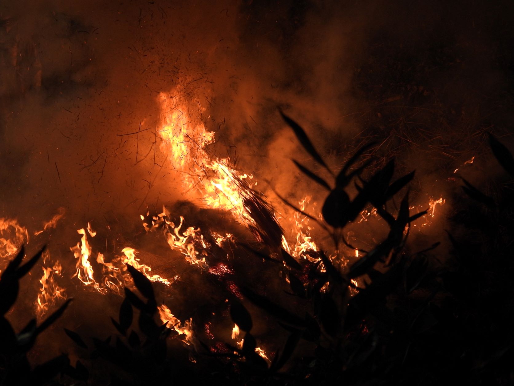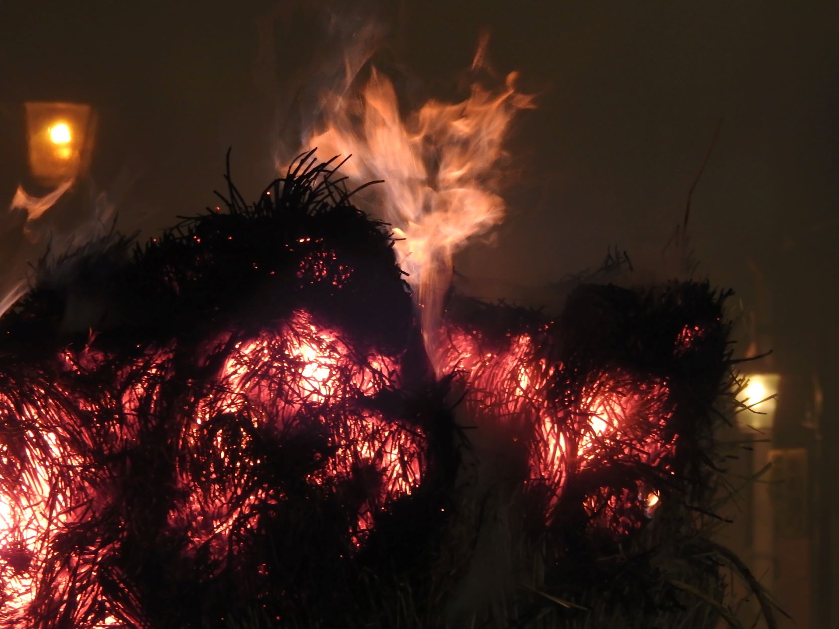 Ab und an fallen brennende Strohballen auf die Straße, aber zum Glück ist die Feuerwehr die ganze Zeit in Bereitschaft.
