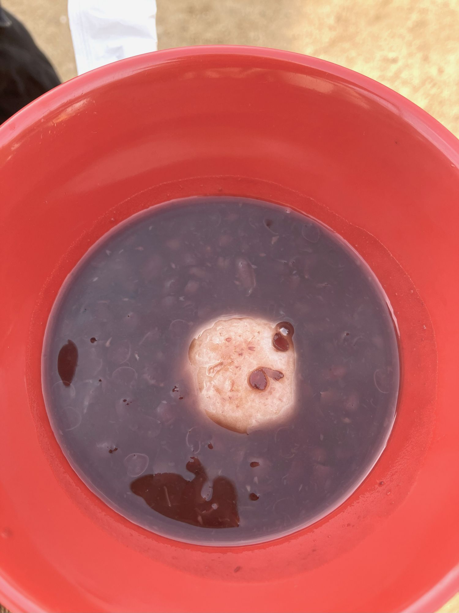 Im Handumdrehen bildet sich eine lange Schlange und im Handumdrehen sind die Reiskuchen aufgegessen, wobei sich die Zahl der schwindenden Reiskuchen in der Zahl der Besucher widerspiegelt.