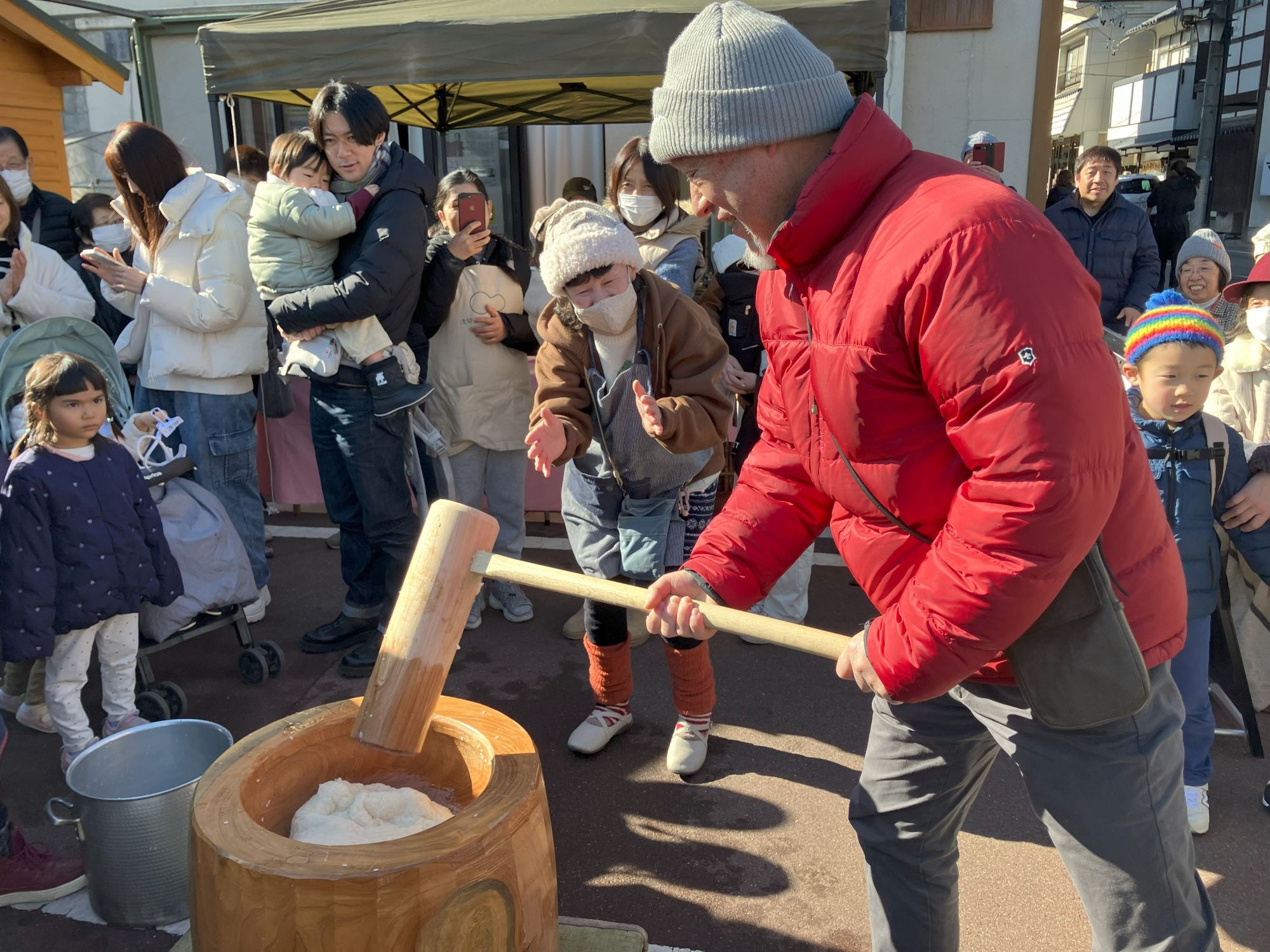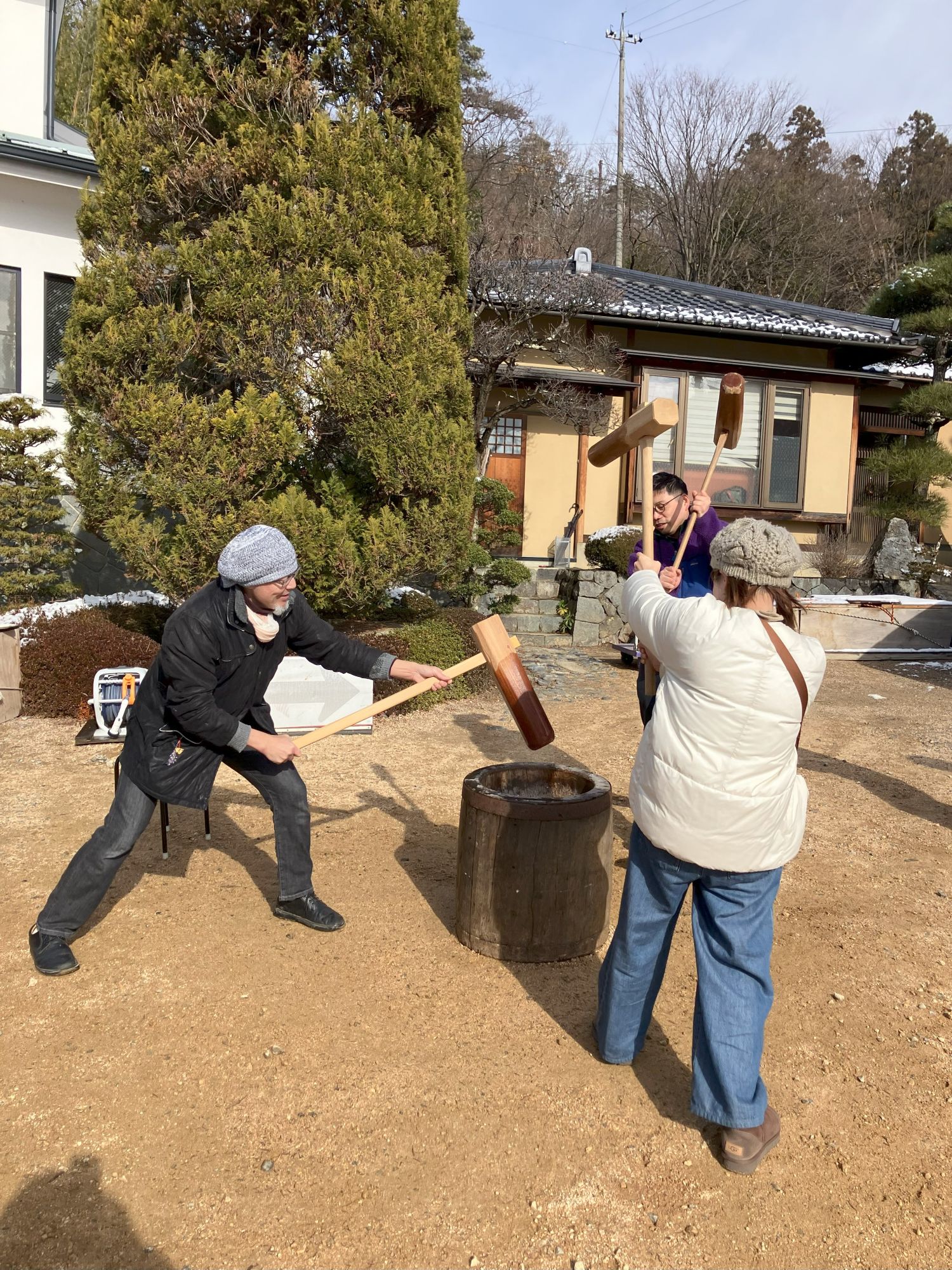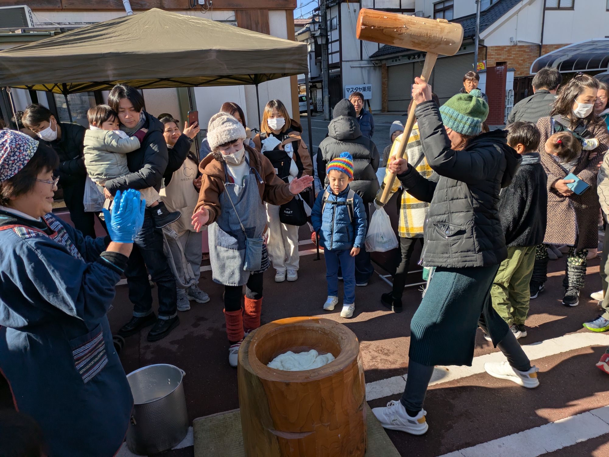 Auch in Matsumoto wurde wieder fleißig der Reiskuchenteig im Holzmörser geklopft und geknetet, zum Beispiel am Jinguji-Tempel und auf dem Waiwai-Marktplatz. Zum Klopfen nimmt man hier einen Holzstößel, auf Japanisch Kine (杵) genannt.