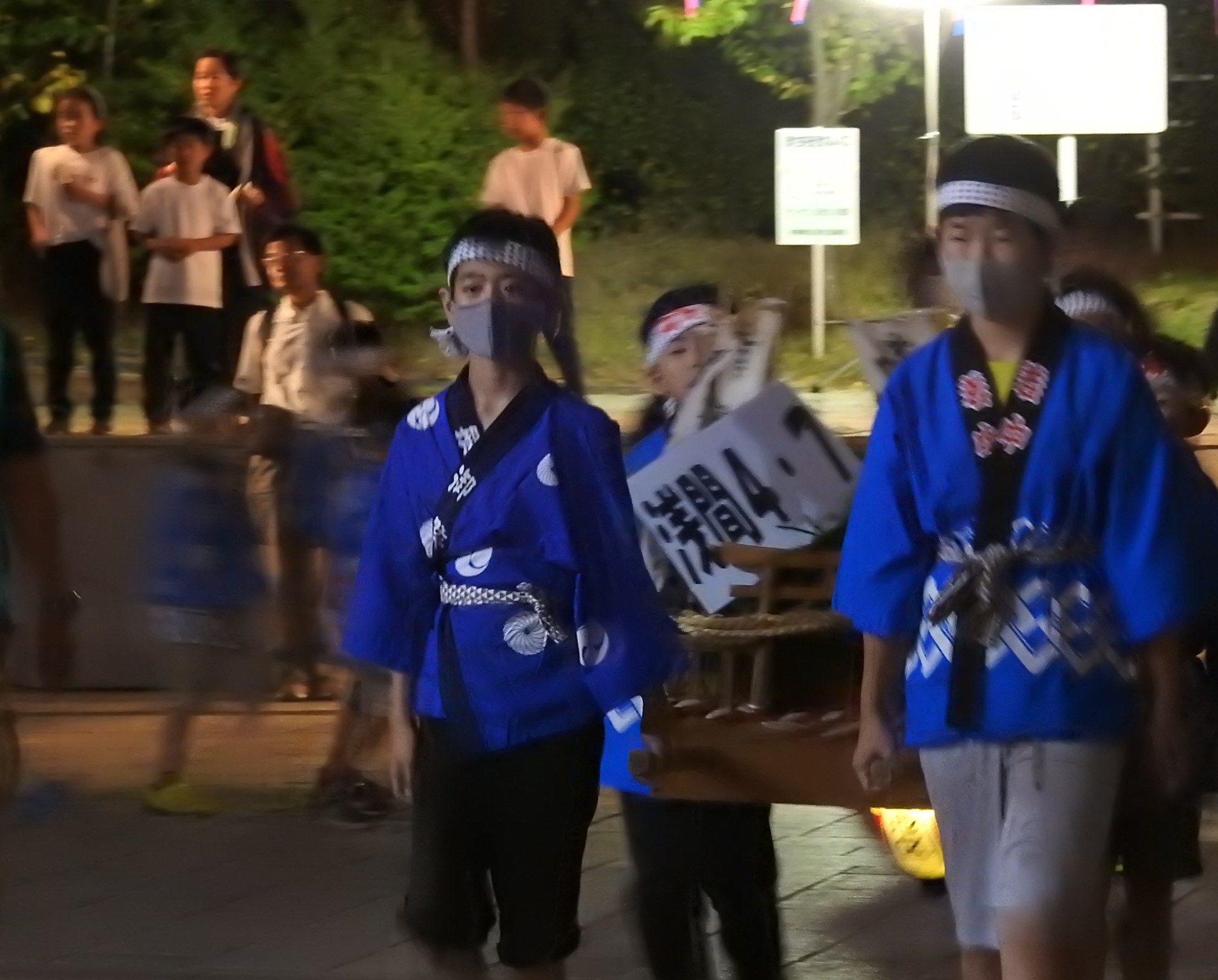 Zum Eröffnungsumzug wird der Aoyama-Schrein von Jungen präsentiert und die Bonbon Lampions von Mädchen.