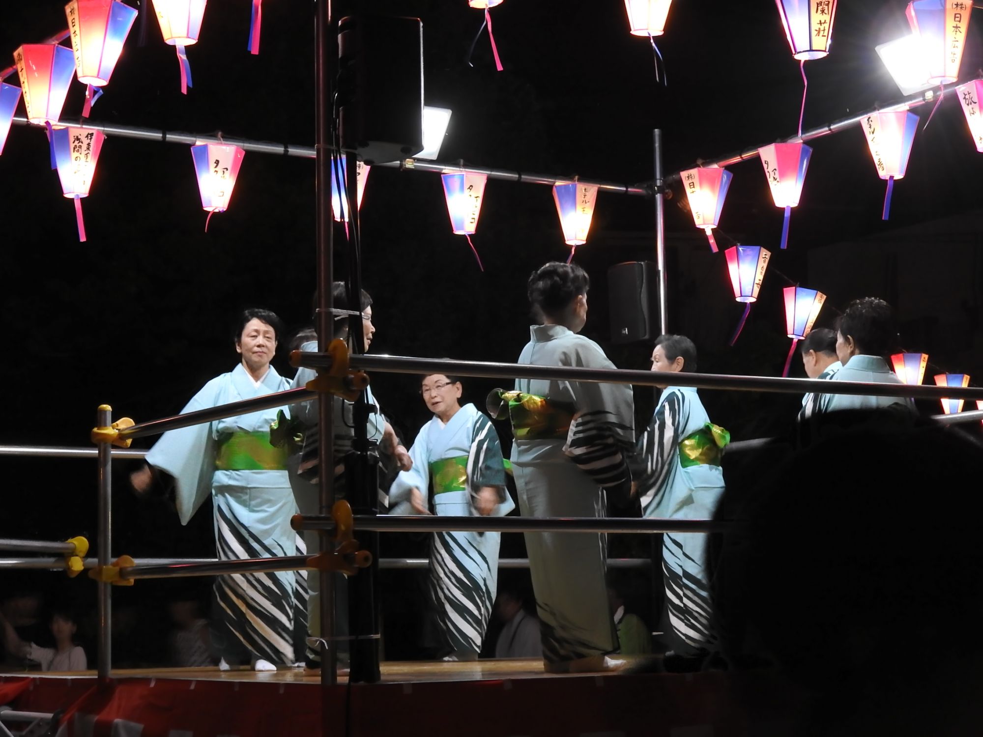 In der Mitte des Platzes befindet sich eine Bühne (yagura), auf der die Vortänzerinnen im Kimono zur Musik tanzen, während die Besucher die Bühne umrunden und mal mehr und mal weniger erfolgreich versuchen, all die Tänze nachzuahmen. Dazu gehören vor allem die tradionellen lokalen Tänze „Asama-bushi“ (Youtube), „Matsumoto-bonbon“ und „Tankobushi“.