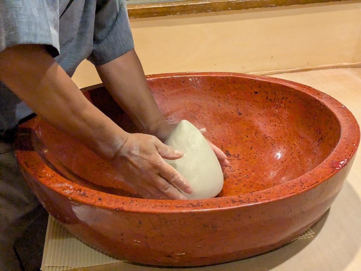 Herr Yamazaki ist Ryokanbesitzer in Asama Onsen – und ein echter Soba-Profi. Mit viel Leidenschaft zeigt er, wie traditionelle Shinshu-Sobanudeln gemacht werden. Für ihn ist Soba mehr als nur Essen: Es ist Handwerk, Tradition und Hingabe.