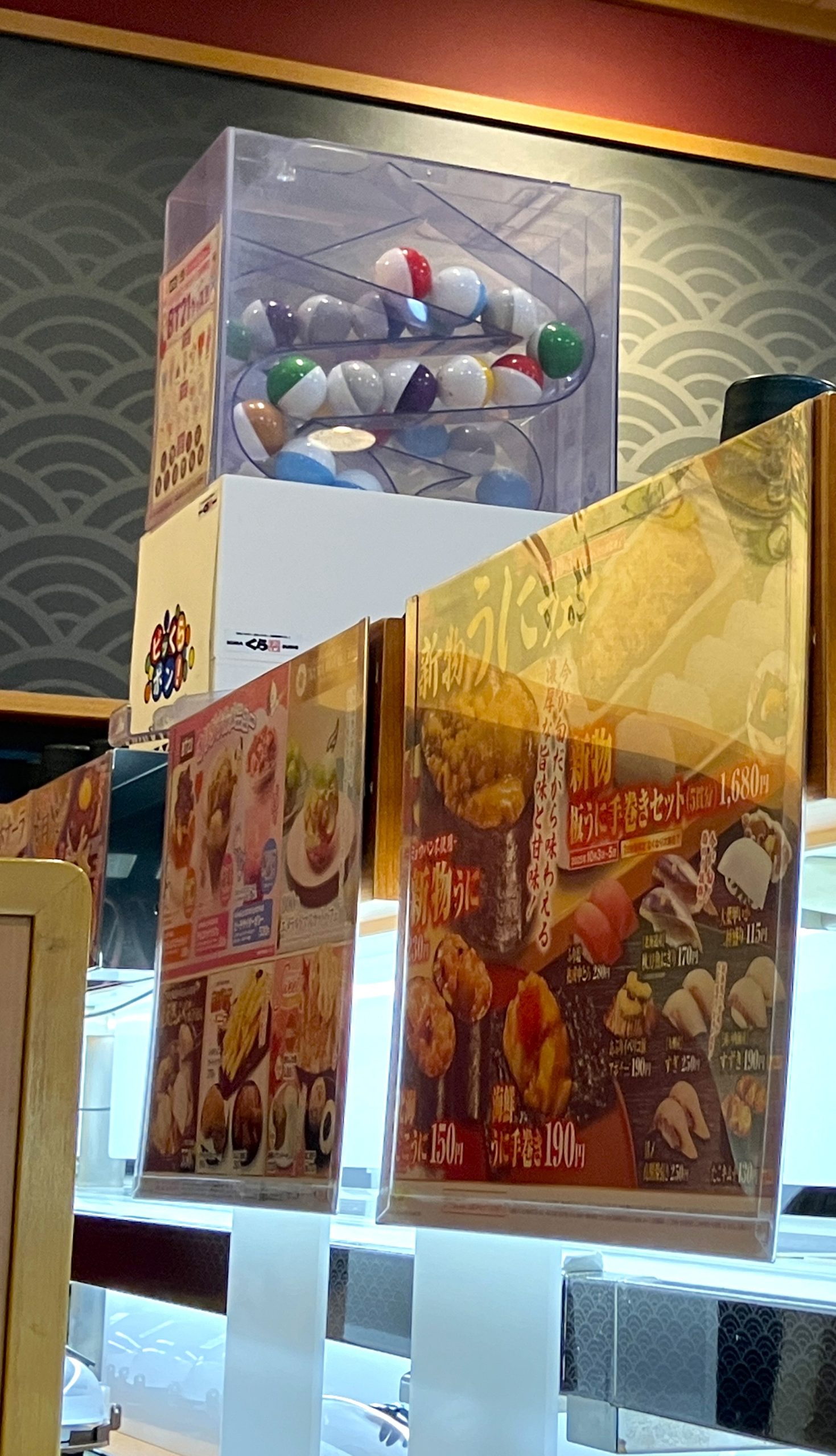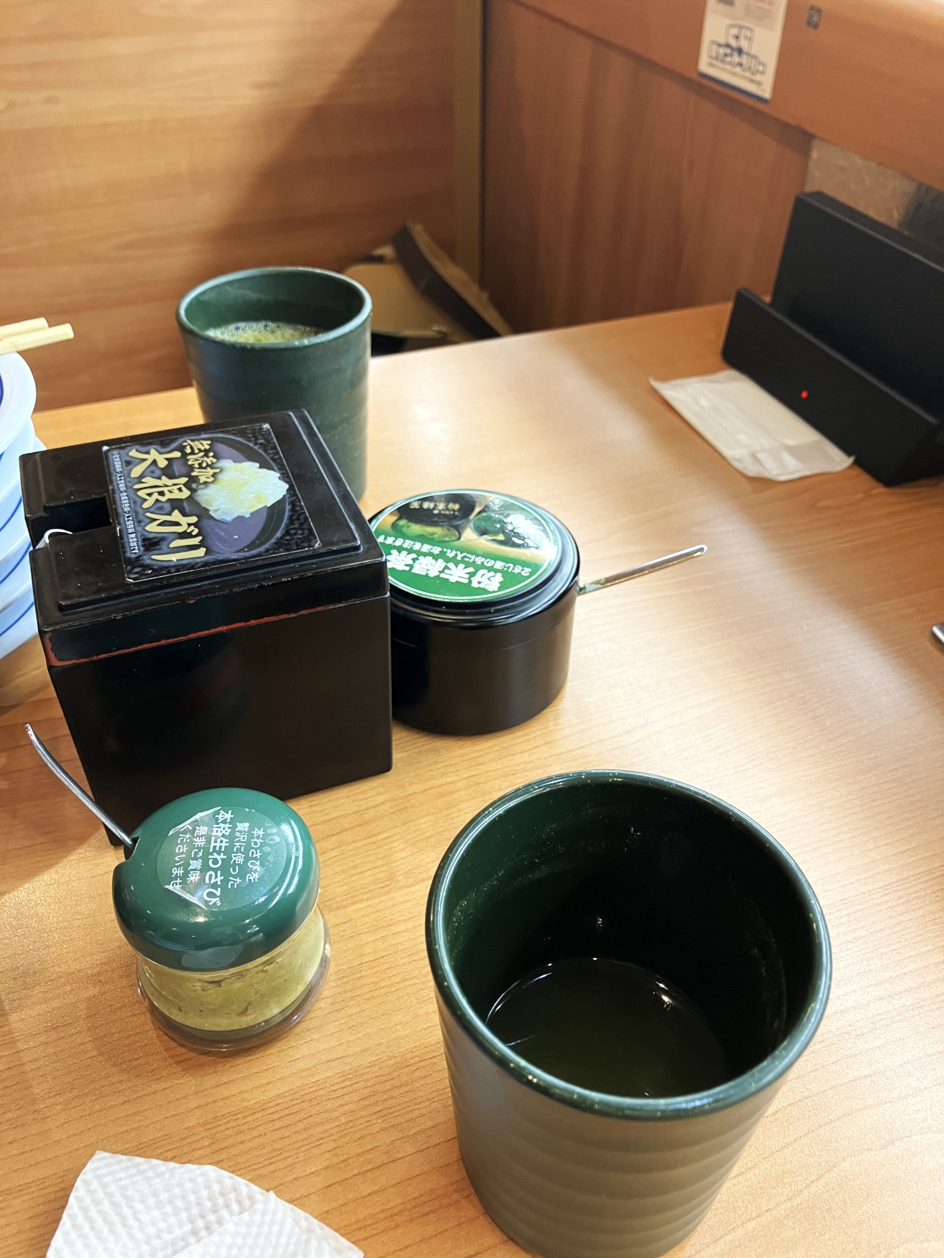 Kura Sushi ist bekannt für Kaiten-Zushi, wo das Sushi auf einem Förderband vorbeifährt und kommt ursprünglich aus Osaka. Als erstes fällt auf, dass der beliebte süß-sauer eingelegte Ingwer, der sonst kostenlos auf dem Tisch steht, hier Geld kostet. Dafür gibt es eine kostenfreie Alternative aus Rettich.
