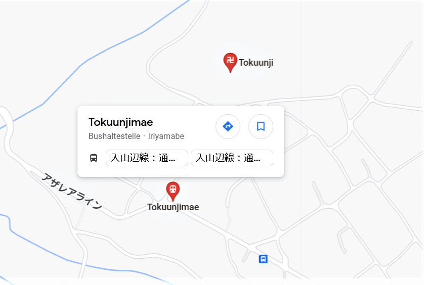 Es fährt auch ein Bus zum Tempel, die Iriyamabe-sen (入山辺線), die Haltestellte heißt Tokuunji mae (徳運寺前).