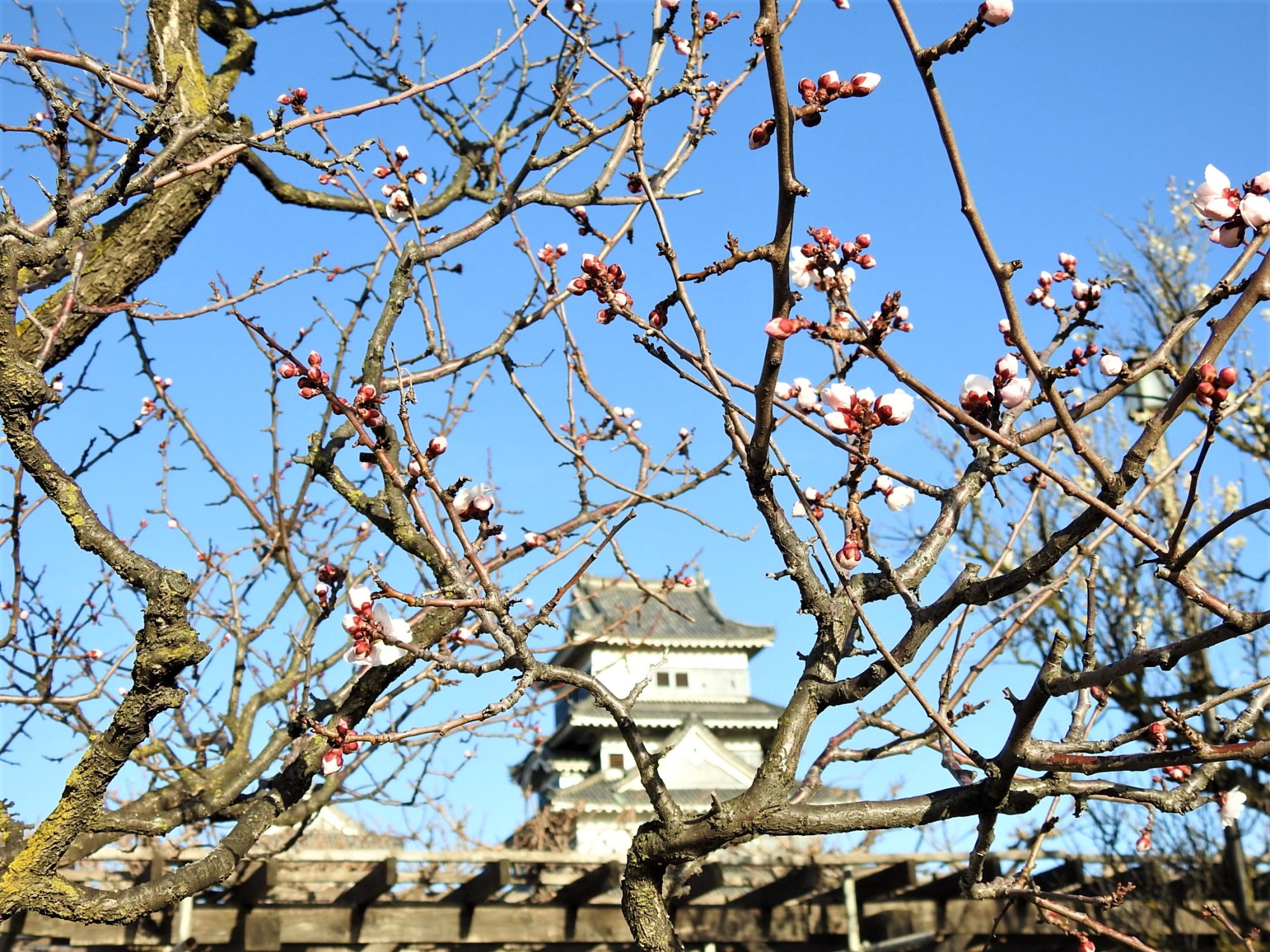 Zum Frühlingsbeginn blühen an der Burg Matsumoto die Pflaumenbäume, noch bevor die Kirschbäume den Burggraben in einen rosa Blütentunnel tauchen.