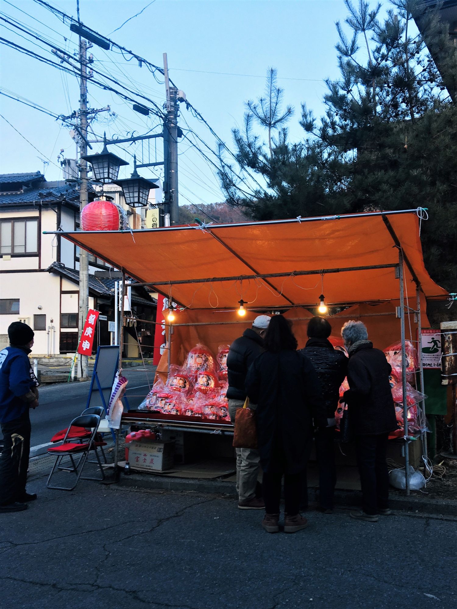 Wer nicht schon in der Nacht am Schrein war, holt das jetzt nach. Man weiß um die vielen Besucher und in der Nähe von Schreinen versammeln sich viele Stände, an denen man zum Beispiel Daruma kaufen kann.