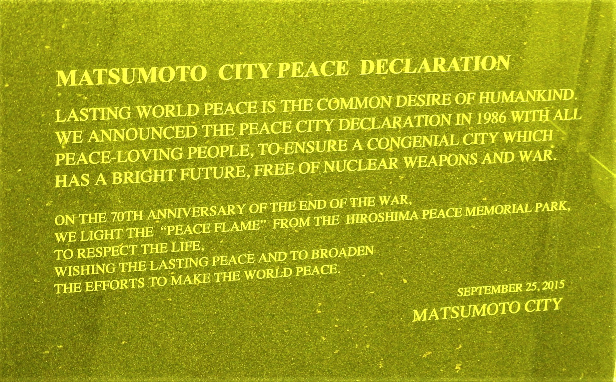 Ein dauerhafter Weltfrieden ist der gemeinsame Wunsch der Menschheit. Wir haben 1986 gemeinsam mit allen friedliebenden Menschen die Friedenserklärung der Stadt Matsumoto verkündet, um eine freundliche Stadt mit einer vielsprechenden Zukunft zu schaffen, die frei von Atomwaffen und Krieg ist. Wir zünden die „Friedensflamme“  vom Hiroshima-Friedensdenkmal an, um das Leben zu achten, fortwährenden Frieden zu wünschen und den Einsatz für den Weltfrieden zu stärken.