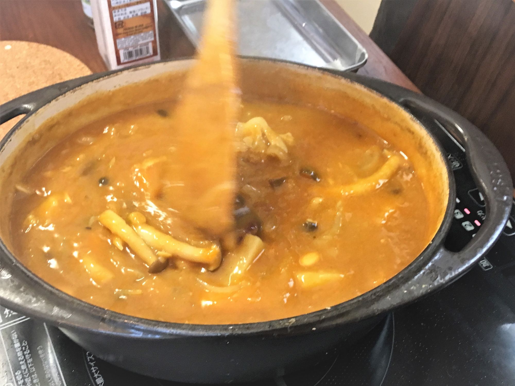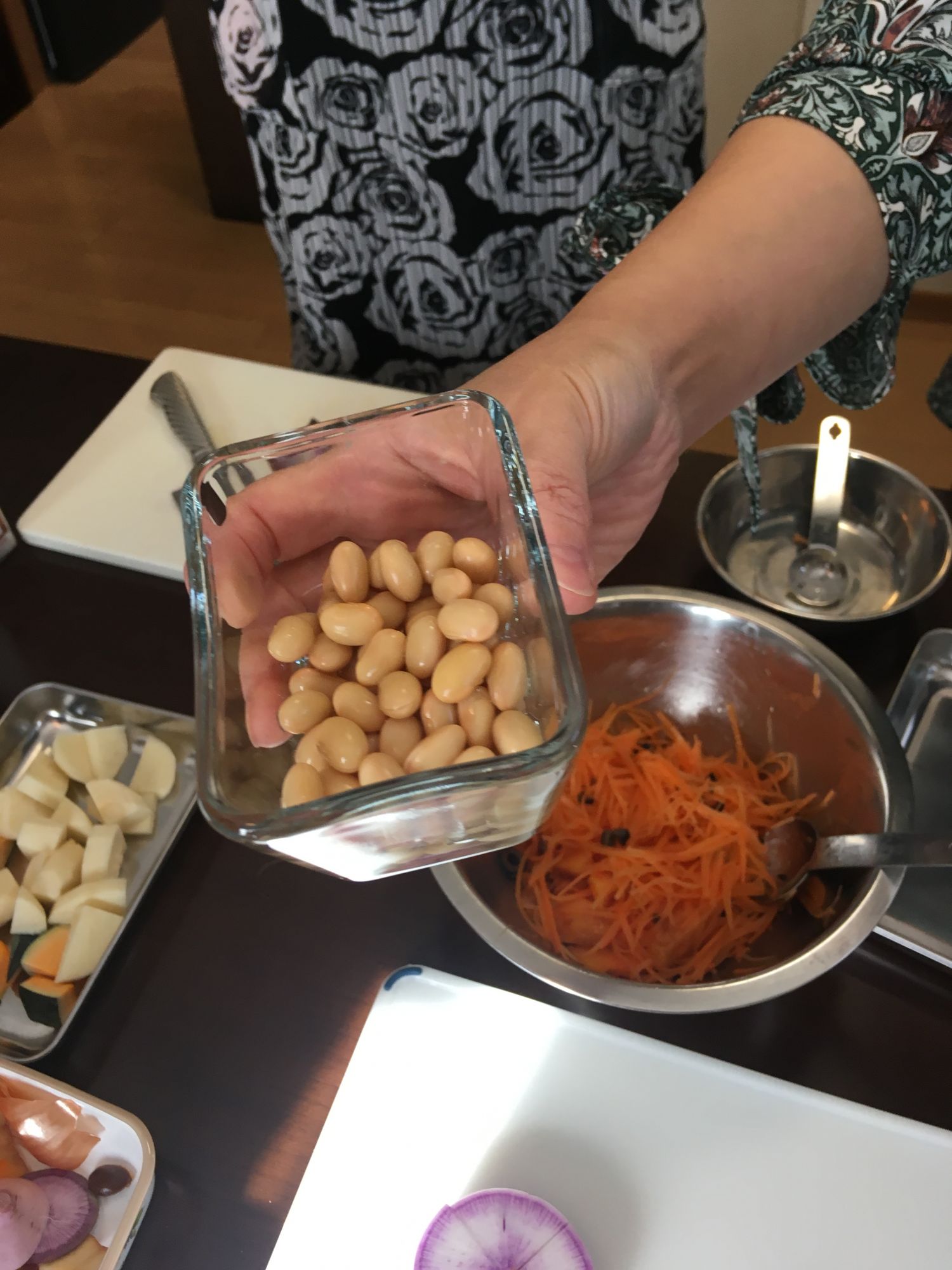 Zwei bis dreimal im Monat finden im Tōshōji Workshops statt. Der heutige Workshop dreht sich um Curryreis. Zu beginn des Workshops werden die Zutaten und Rezepte vorgestellt. Neben Curryreis stehen frittierte Seitan-Steaks, Möhren-Oliven-Kaki-Salat, Nozawa-Miso-Gemüsepfanne und als Dessert Süßkartoffelgelee (imo-yōkan) auf dem Programm. Wir sind fünf Teilnehmerinnen und eine Lehrerin und in ca. drei Stunden wird ein Menü gezaubert, das uns alle staunen lässt.
