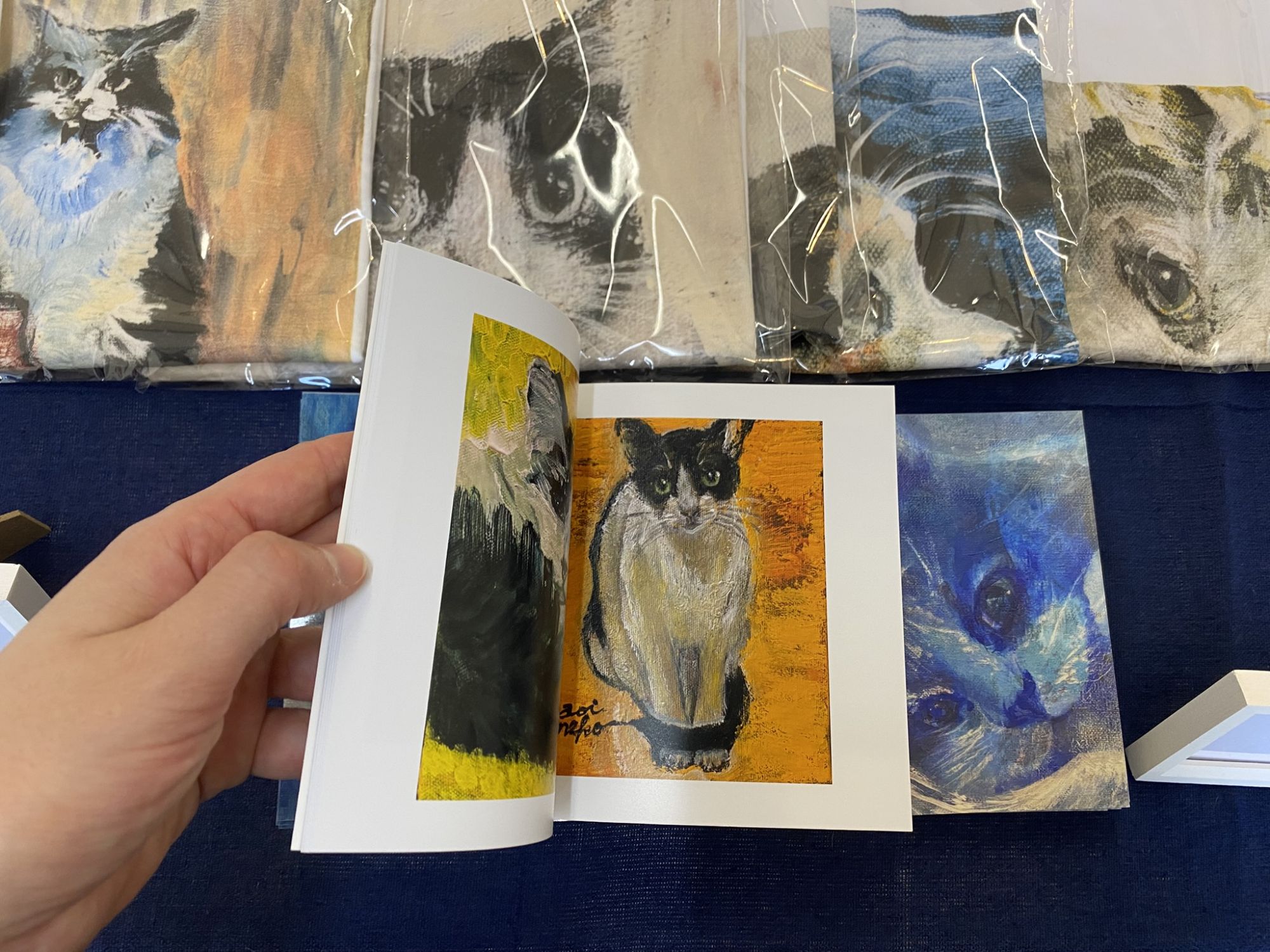 She keeps a rescued cat who is the inspiration for her art and raises funds for cat shelters (she made a charity calendar as well)
