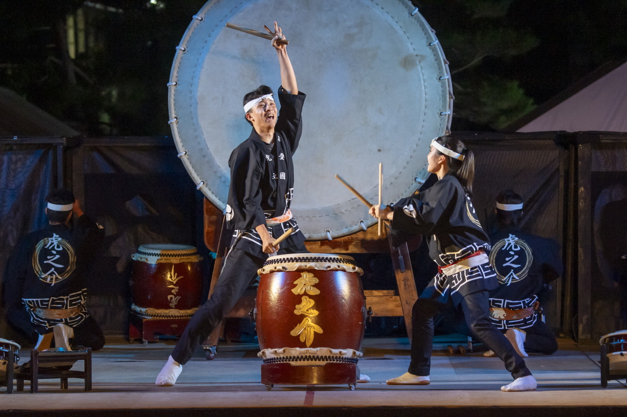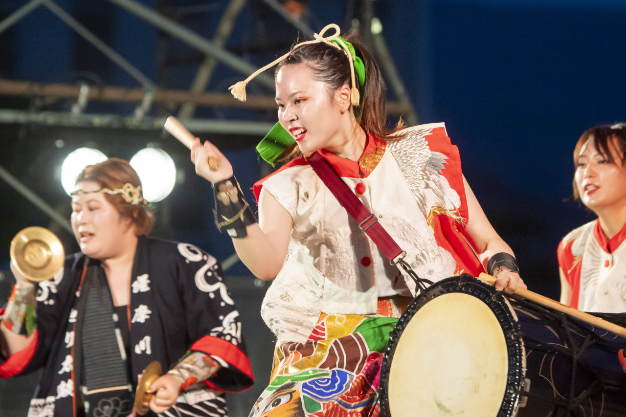 The powerful drum performance born of strength and skill resounds through the summer night.