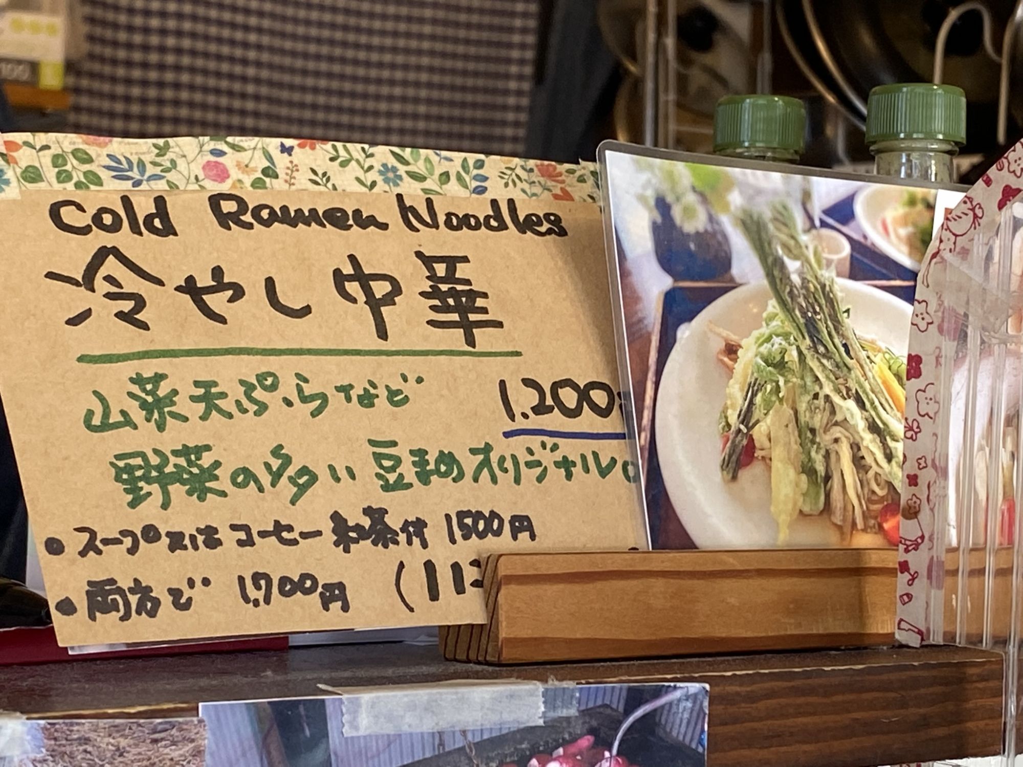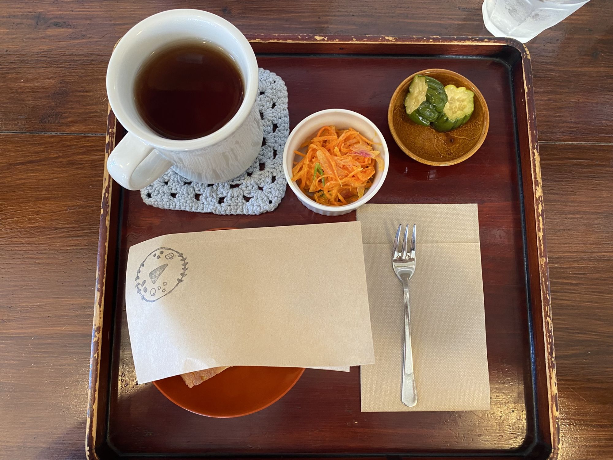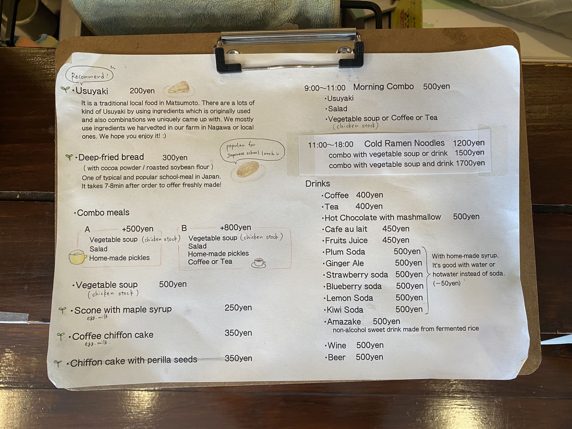 It includes a drink (hot coffee, hot tea, soup), homemade pickles (the owners grow the vegetables themselves), a salad and one usuyaki of your choice.