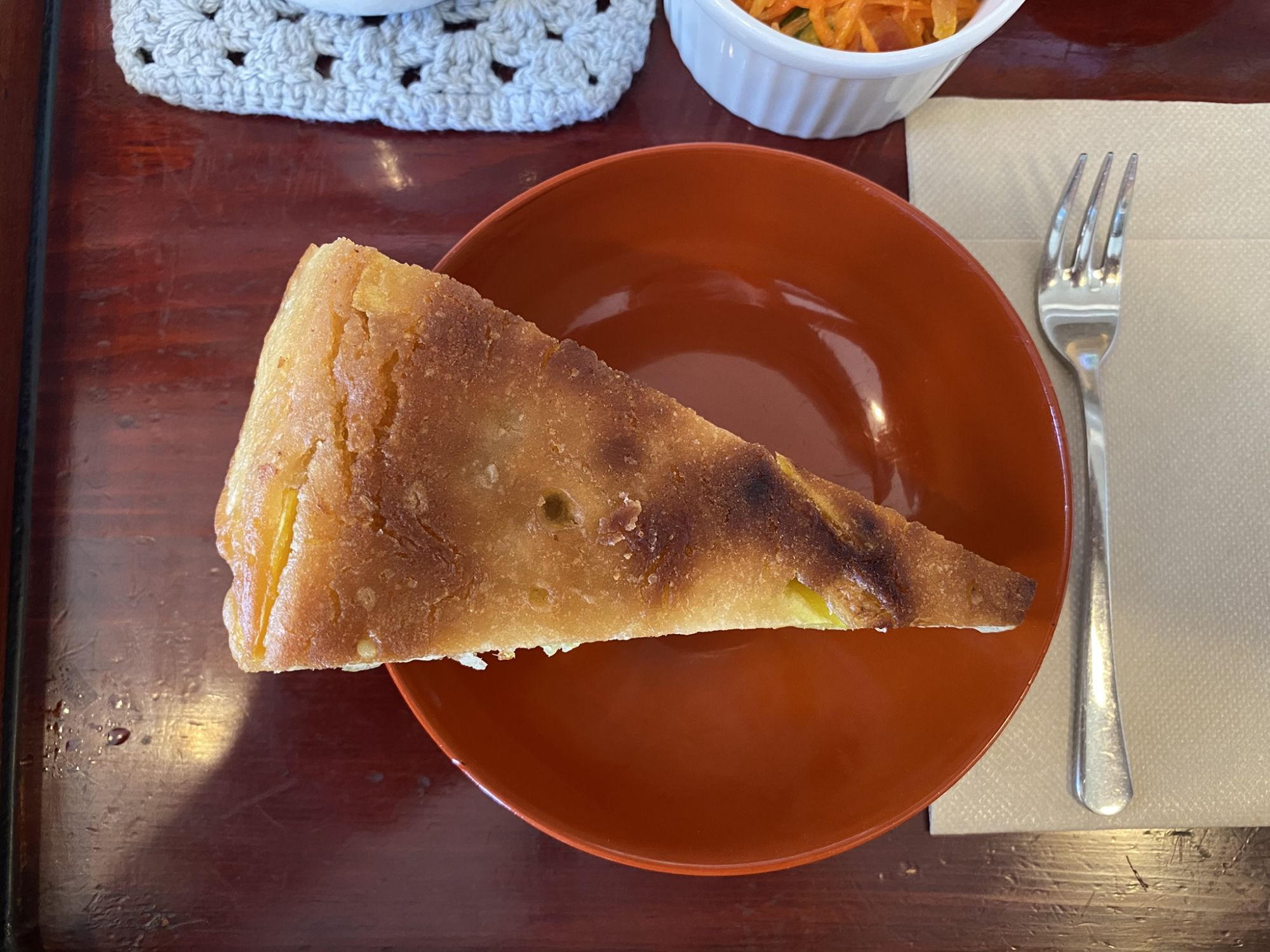 What is usuyaki? It is one style of oyaki. When people were not full after finishing their meal, they would make these flour and water pancakes, add in some ingredients (local vegetables) that they had at hand, and fried in a frying pan with oil.