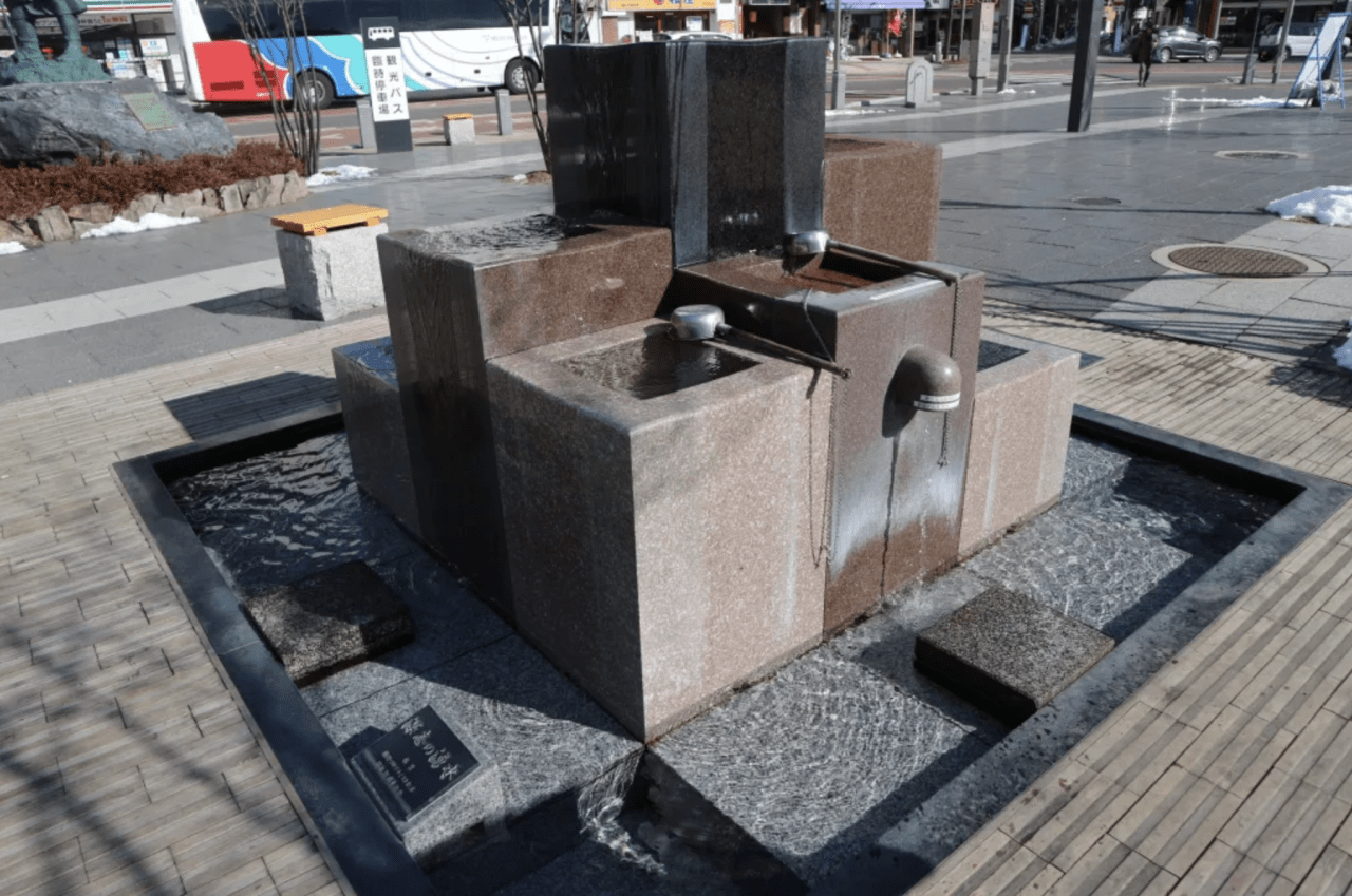Fukashi Spring, located at Matsumoto Station's Castle Exit Plaza. This spring was developed as part of the 2016 "Water and Green Space Improvement Project." It symbolizes the water culture of the castle town, being the first spot visitors encounter upon arriving in Matsumoto by train or bus. Clear