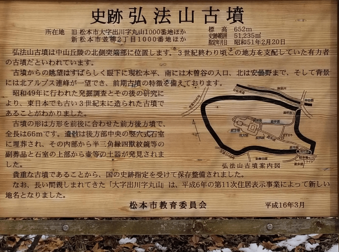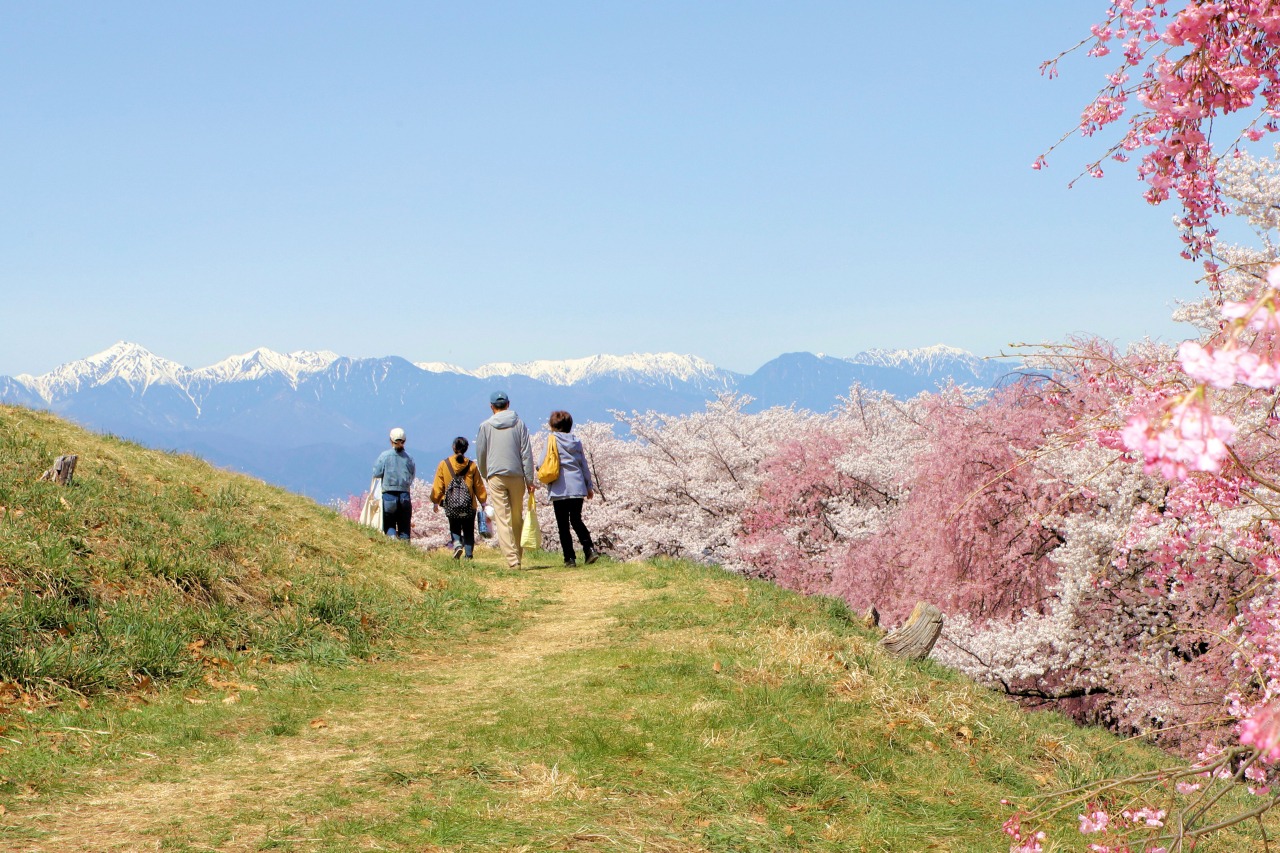 atop the mound offers an expansive view stretching over 200 degrees from east to north and west. On clear days, the open vista extends to the peaks of the Northern Alps. In spring, cherry blossoms bloom encircling the tomb, creating a harmonious landscape where historical scenery blends with floral colors.With walking paths and information boards in place, it's a quiet tourist spot where you can stroll while pondering the origins of Matsumoto.