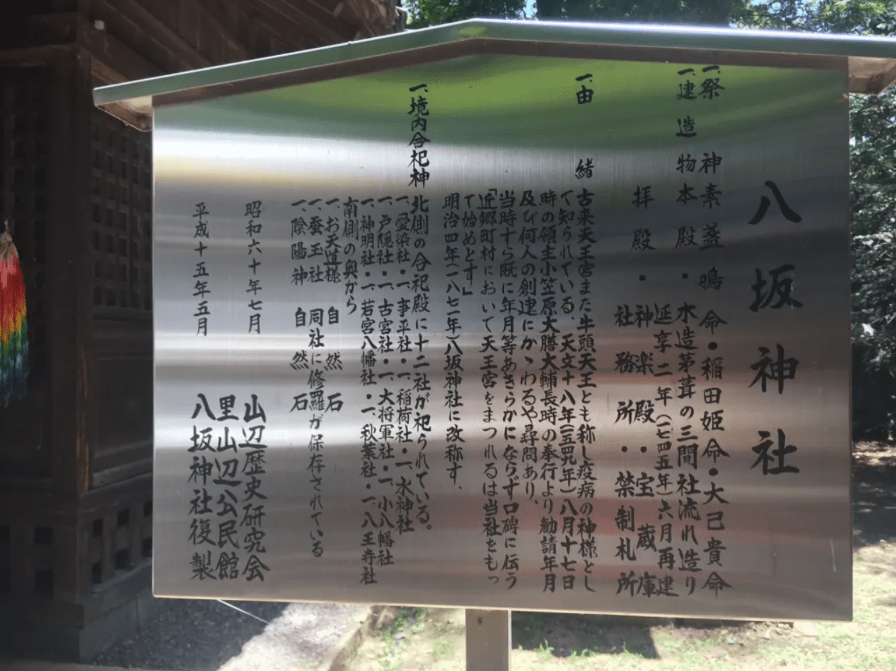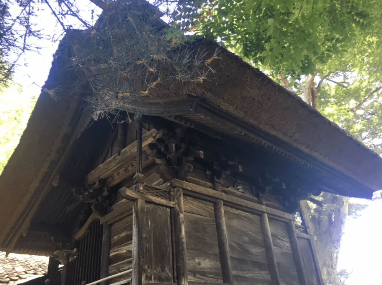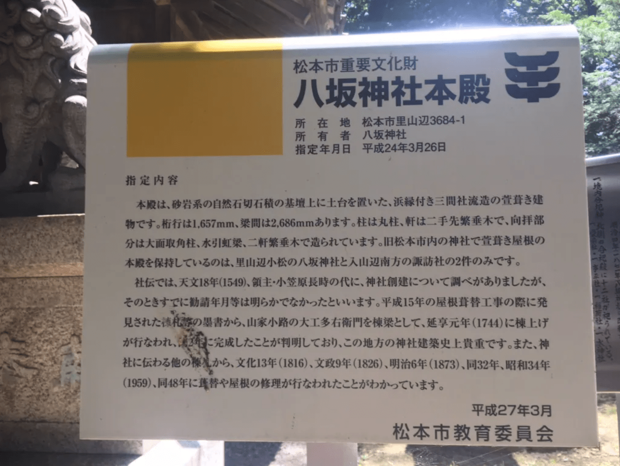 The main hall of Yasaka Shrine, located in Satoyama-be, Matsumoto City, is a thatched-roof wooden shrine hall dating from the mid-Edo period (around 1744). It is registered as a City-designated Tangible Cultural Property. Its thatched roof and the imposing structure of the three-bay nagare-zukuri style are highly valuable in the history of shrine architecture, representing one of the few remaining examples in the Matsumoto Plain. During restoration work in the Heisei era, the original ridge plaque from the time of its construction was discovered.Alongside the history of the surrounding Satoyamabe district, it is a precious cultural asset that conveys the region's faith and landscape to the present day.