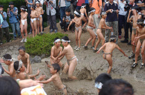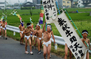 晒し木綿のふんどし姿のこども達が、紙幅を持ち、疫病退散、五穀豊穣、厄除けを祈り、掛け声をかけながら地区内を行進します。津島神社に戻り、傍らの池に飛び込み禊を行う元気な祭りです。