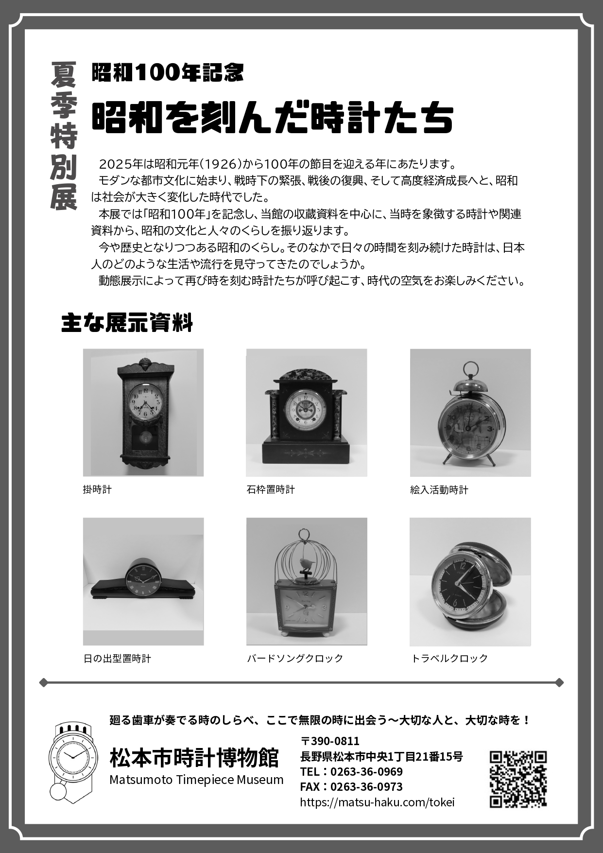 2025年は昭和元年(1926)から100年の節目を迎える年にあたります。本展では「昭和100年」を記念し、当館の収蔵資料を中心に、当時を象徴する時計や関連資料から、昭和の文化と人々のくらしを振り返ります。