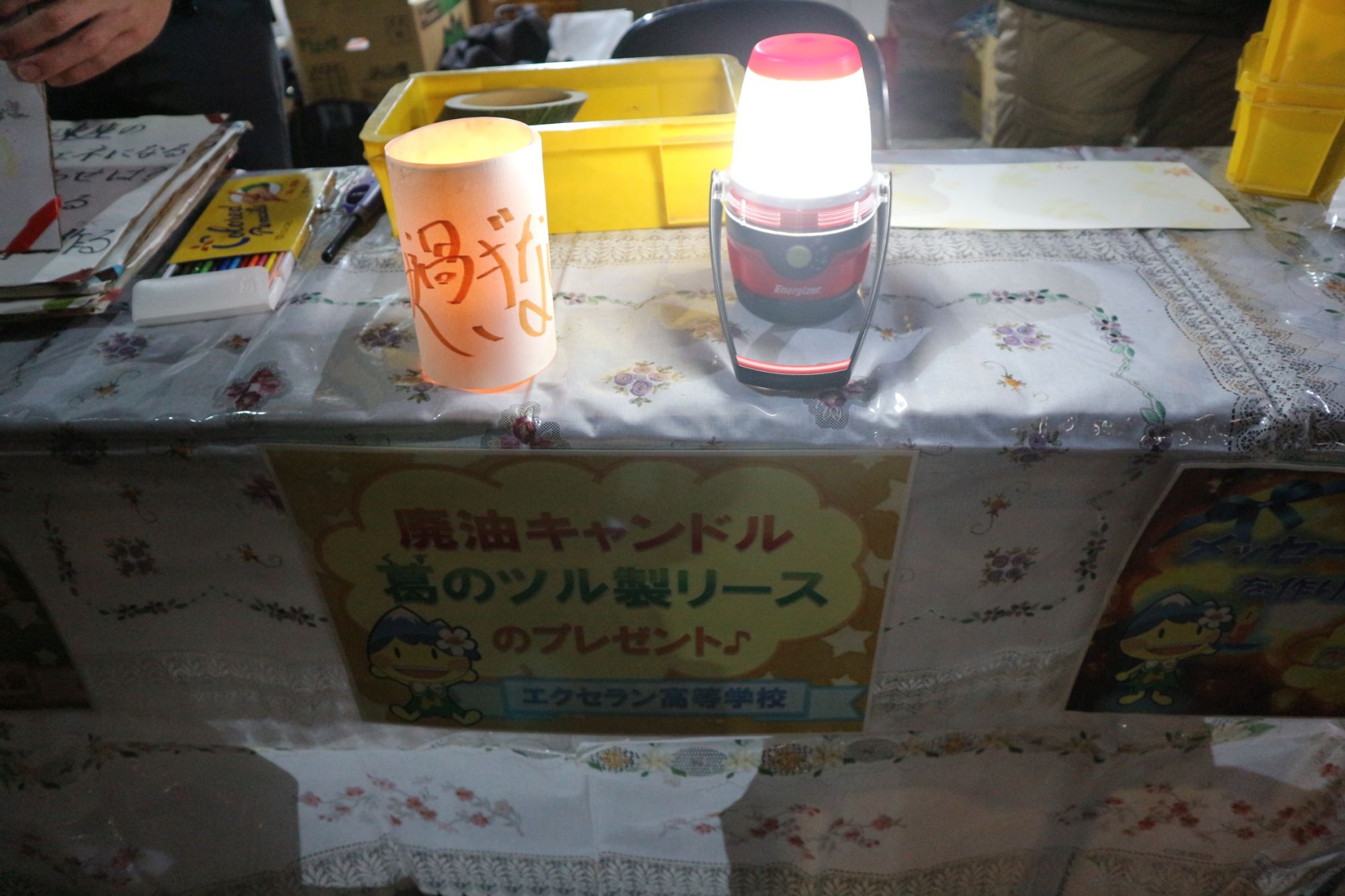 内容(予定) ⑴ 蜜ロウ製エコキャンドル(約250個)の展示 ⑵ メッセージキャンドルの製作体験 ⑶ 手作り廃油キャンドル・葛のツル製リースの配布(エクセラン高等学校) ⑷ ホットココアの提供