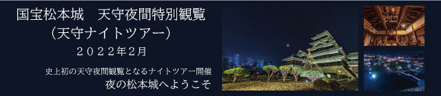 令和4年2月の週末に「国宝松本城 天守夜間特別観覧(天守ナイトツアー)」を開催します。夜間の松本城天守への入場は史上初の体験です。松本城イルミネーション及びまつもと冬割キャンペーンなどとともに、冬期間の松本へお越しくださるお客様へ新たな松本観光の魅力を提供します。参加には事前のお申込みが必要です。
