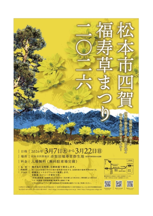 福寿草は「元日草」とも呼ばれ、昔から多くの家庭で「お正月の床飾り」として重宝がられ親しまれてきました。松本市四賀地区の福寿草は、日本の原生種で、区域内に数十万株が自生し大群落を形成しています。 福寿草の花は、日が照れば開き陰れば閉じることを繰り返しながら2~3 週間咲き続け、おおよそ3 月のお彼岸頃に北向き斜面の段丘を黄金色に染めます。 心なごますこの景色をいつまでも大切に残したいものです。