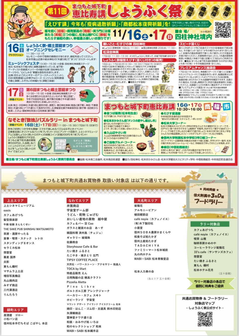 【会場:四柱神社境内】 ●金つば販売(10:00~16:00) ●しょうふく祭福笹えびすの販売(10:00~15:00) ※招福富くじ付き福笹セット ※内容は前日と同様 ●おかみさん会タンスの肥やし掘出し市(10:00~16:00) ●入山辺やさい市(10:00~16:00) ●松本大学コーナー(10:00~16:00) ●信大附中3Dコーナー(10:00~16:00) ●えびす講グルメ・コーナー(10:00~16:00) ●えびす居酒屋(10:00~16:00) ●中信街商組合“縁日” <アトラクション> ●プレミアムチャンス抽選会(15:30~15:45) ※神楽殿ステージ 賞品:まつもと城下町お買い物券・特別協賛品 抽選方法:スピードくじのプレミアムチャンス (シリアルコードによるデジタル抽選) 当選発表:各当選番号の発表(Webでの同時発表)