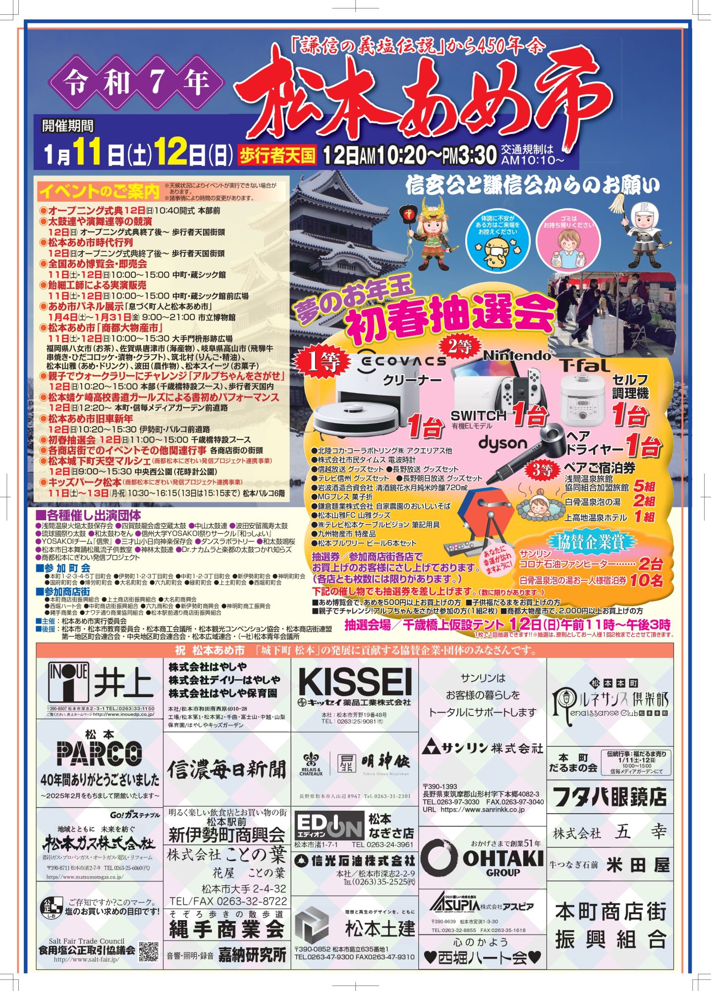 当日は、日本各地の有名なあめや珍しいあめが並ぶ「全国あめ博覧会・即売会」や、姉妹都市の高山市、九州の物産の販売のほか、上杉軍・武田軍に分かれて綱引きを行う「塩取合戦」、「初春抽選会」「時代行列」「太鼓連と演舞連の競演」に加え、歩行者天国内の商店街ではさまざまな催しが行われ、松本の新春の一大イベントとして多くの来街者で賑わいます。