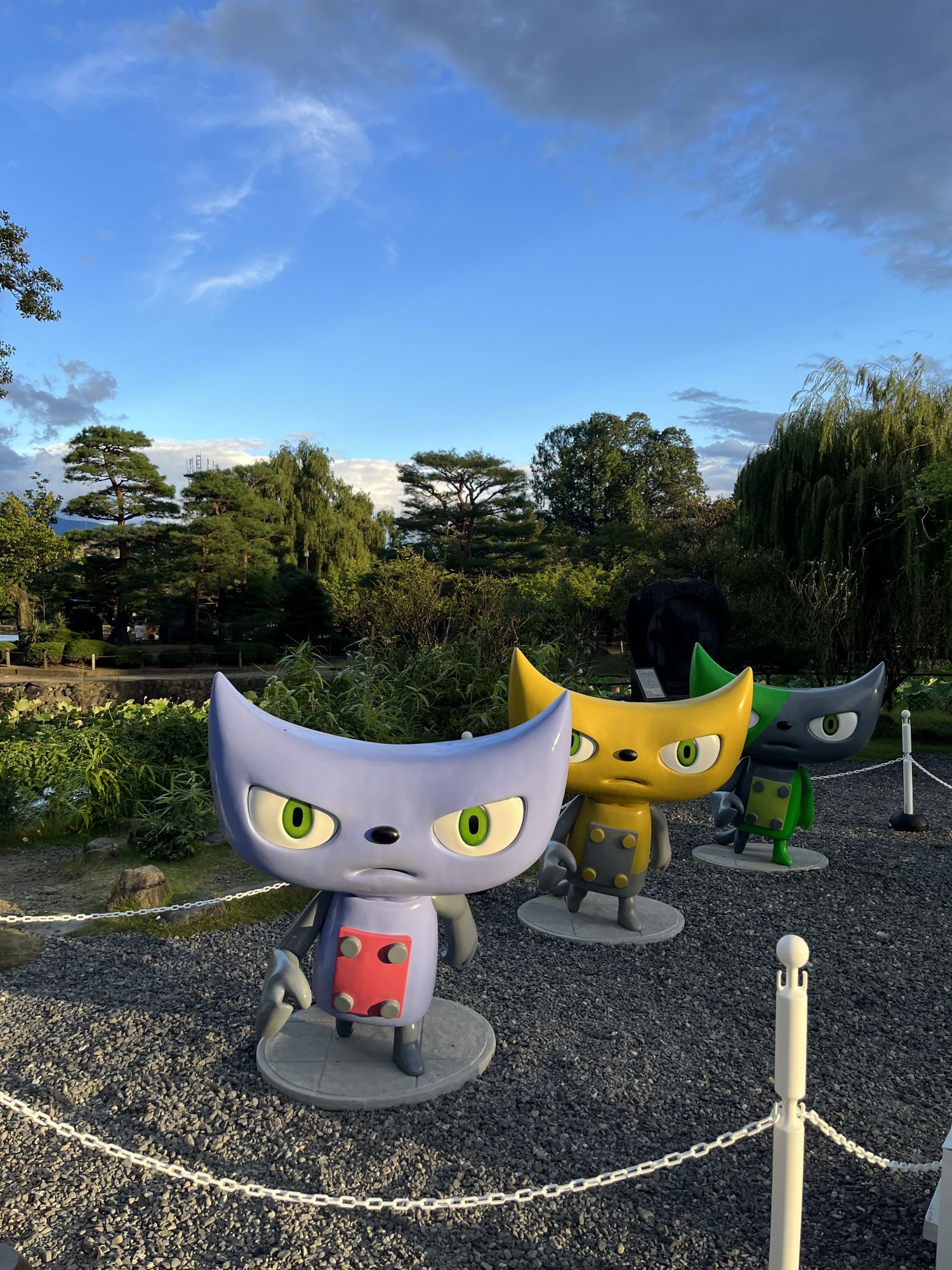 Dans le centre ville sur le pont Sensaibashi ou dans le parc extérieur du chateau, on peut retrouver quatre grandes statue de Y-cat, ces chats colorés qui servent de mascotte a l’univers du réalisateur.