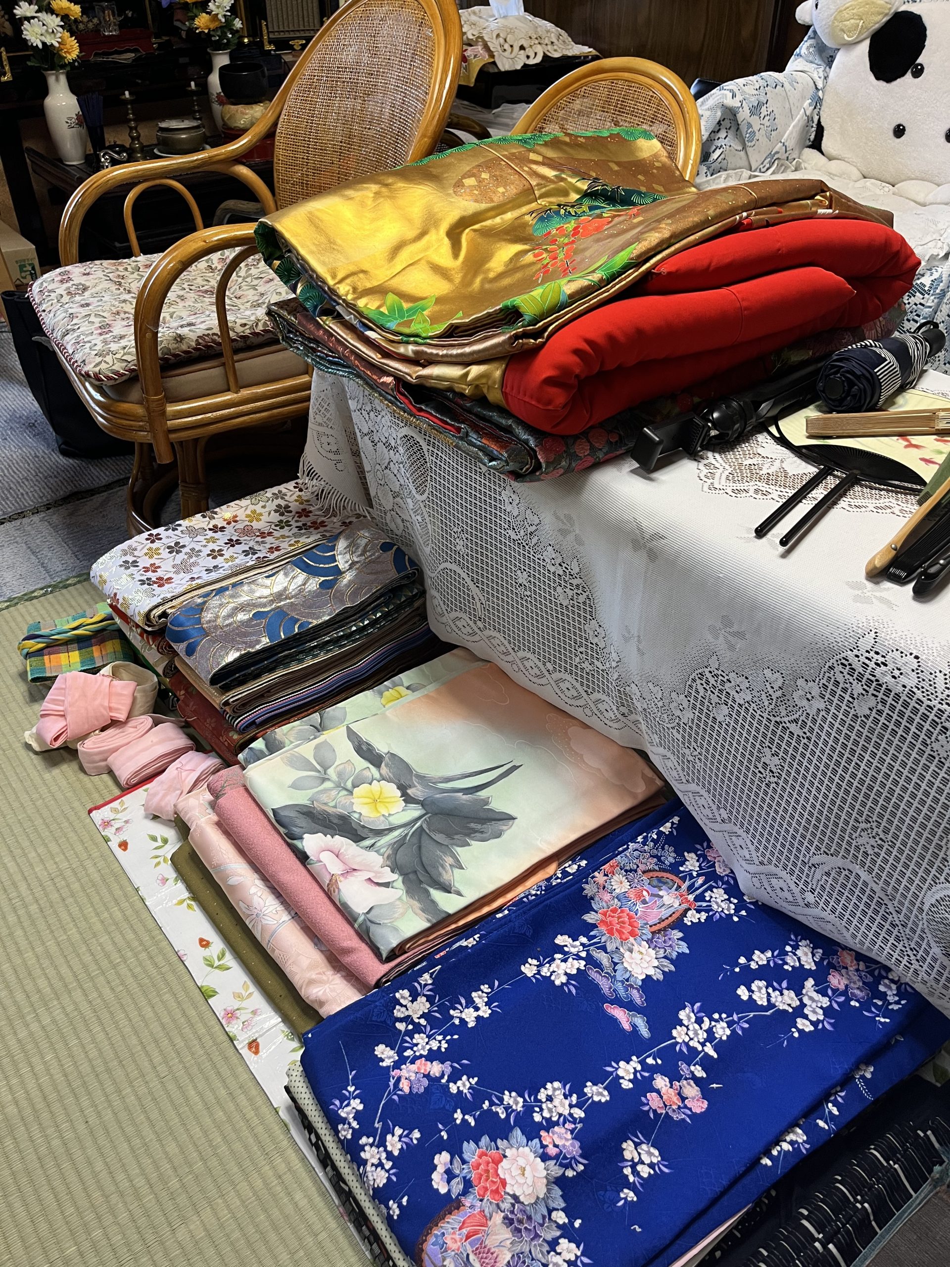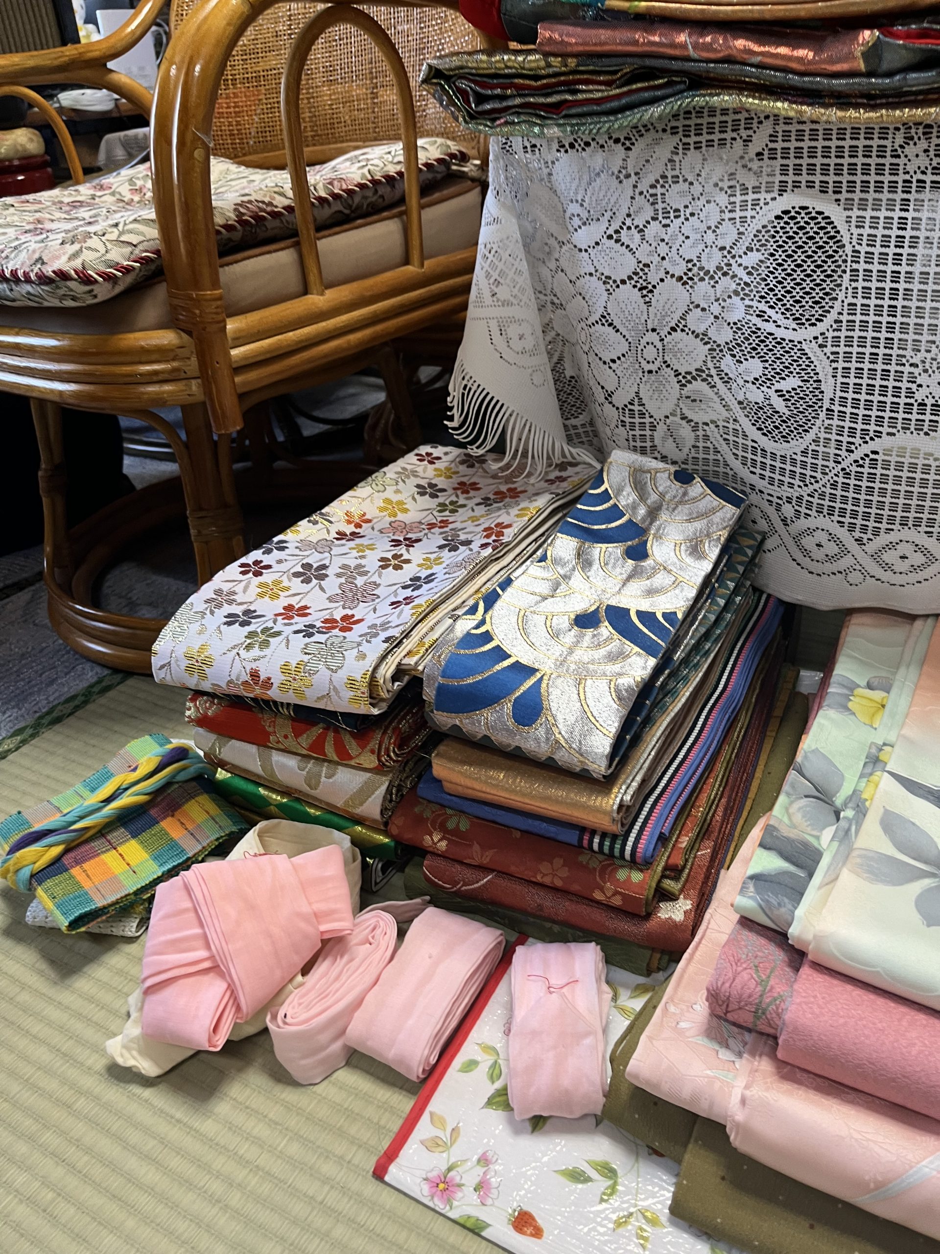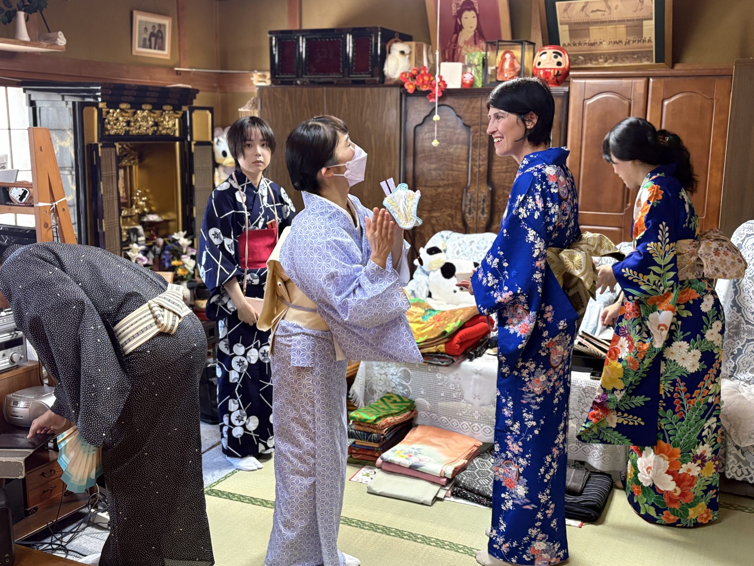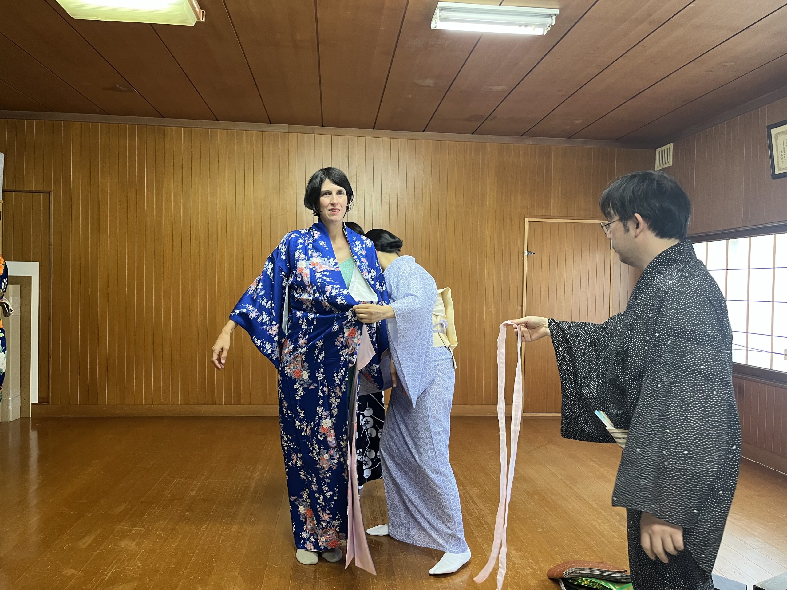 L’expérience a commencé par l’habillage. J’ai pu choisir un kimono parmi plusieurs aux couleurs et motifs variés : fleurs délicates, paysages symboliques ou tissus plus sobres. Se laisser habiller avec soin, sentir le tissu se poser sur soi, voir le nœud de l’obi se former dans le dos… c’est déjà une immersion culturelle à part entière. Porter un kimono change la posture, la démarche, et prépare à entrer dans l’univers du Nihon Buyō.