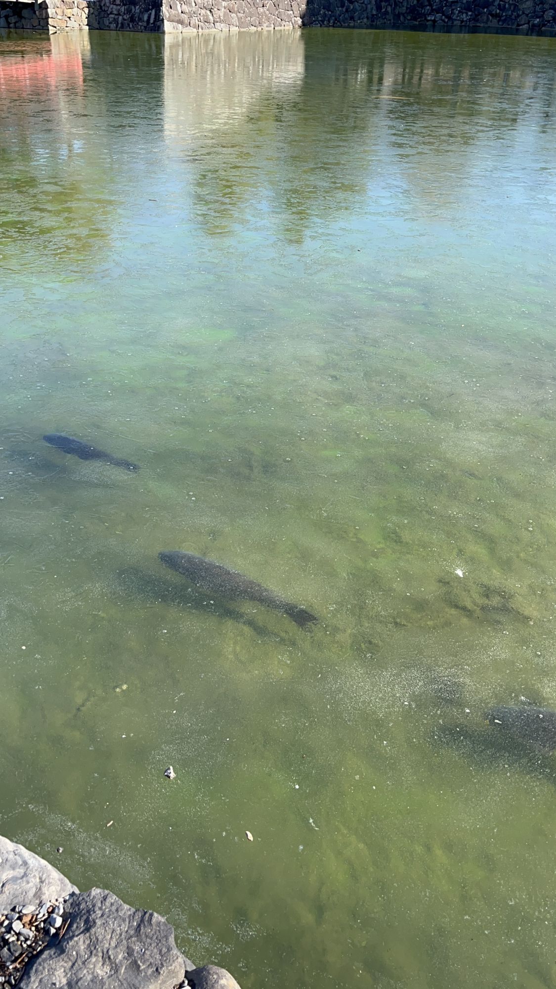 En ce matin du 14 janvier, les températures atteignent -9 degrés et au moment de notre balade vers 10h il fait encore -5 degrés et l’eau des douves du château est gelée. On peut d’ailleurs observer les carpes qui y vivent nager sous la glace pour le grand plaisir des enfants (et des grands aussi).