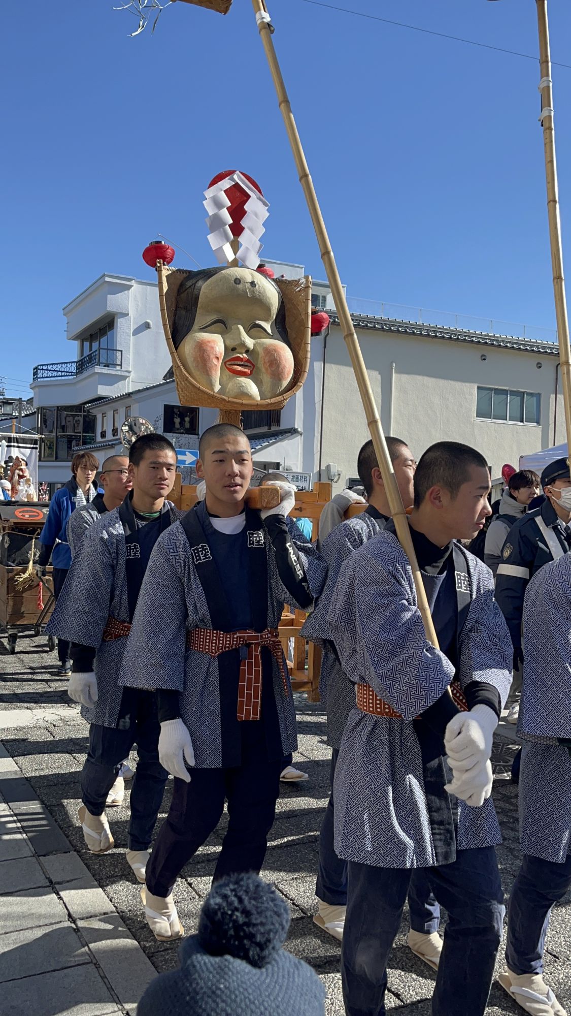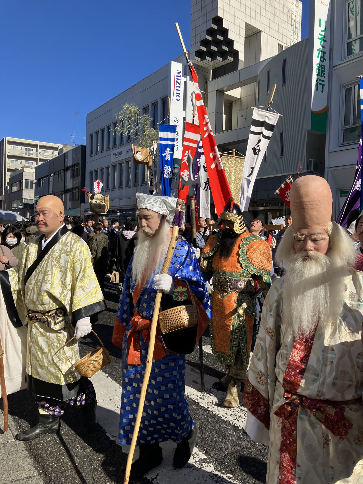 Un des grands événements de la journée est la parade des Sept Divinité de la Fortune. Les participants sont tous habillés de costumes traditionnels et on reconnaît facilement les sept divinités grâce à leurs attributs distinctifs. Ils paradent dans tout le centre ville au son des tambours taiko en distribuant des bonbons aux passants. On peut aussi apercevoir un grand fuku-omen, masque au visage joufflu, devenu le symbole des bonbons « Fuku-Ame » mentionnés précédemment.