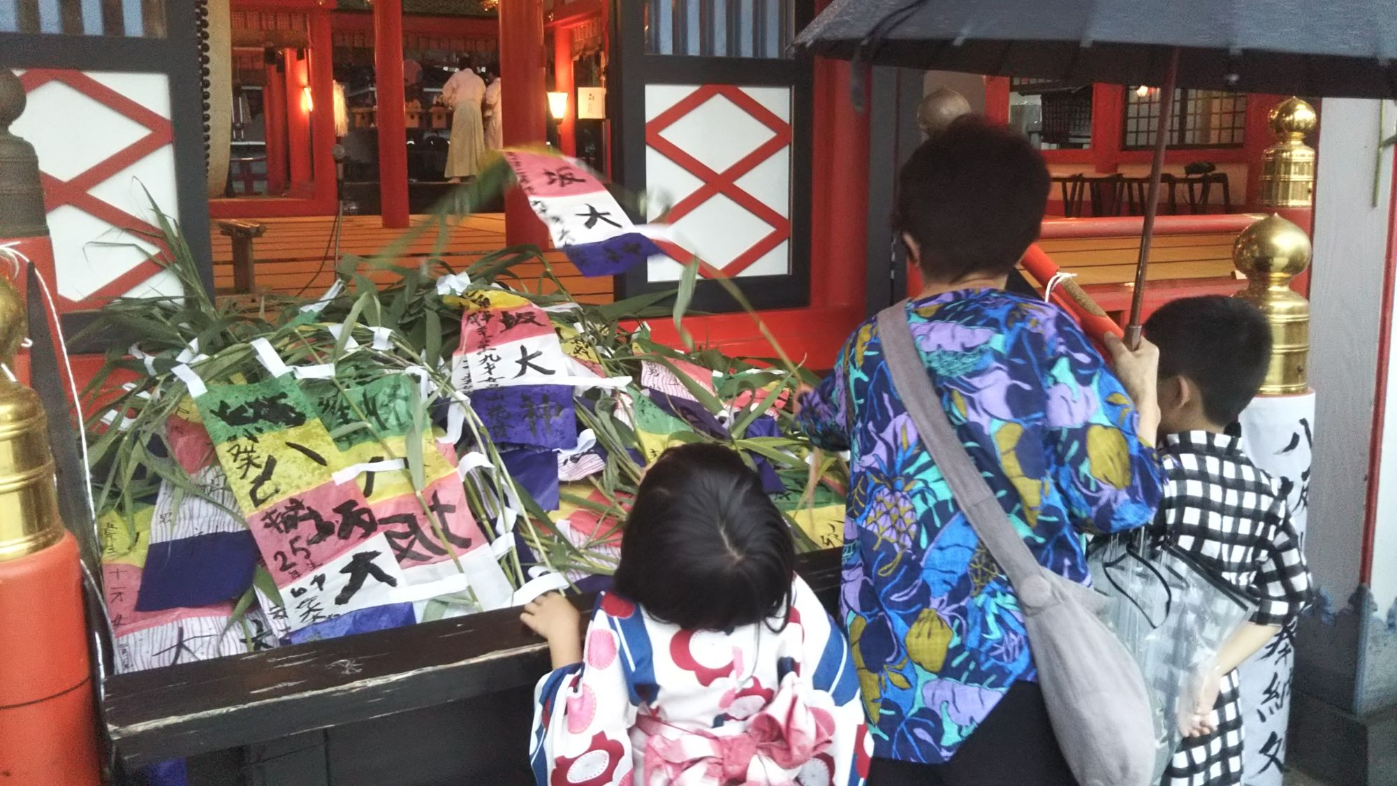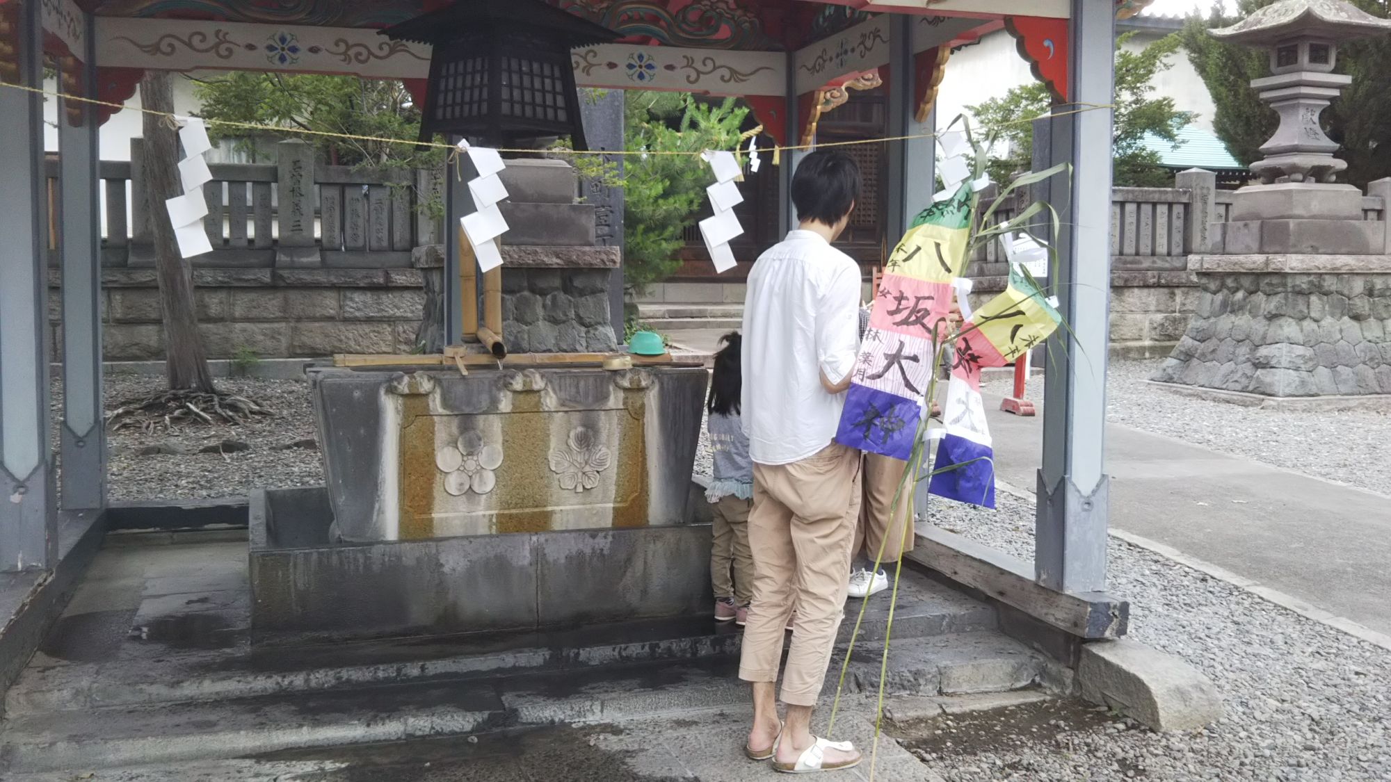 Traditionnellement à destination des enfants, cette fête a évolué avec le temps et de nos jours, ce festival est célébré par l’ensemble des habitants de la ville, petits et grands. Ce jour-là, les habitants achètent une bannière composée de 5 couleurs différentes et où l’on écrit le nom du Dieu Yasaka Sama en gros sur la bannière puis, à gauche en plus petit, la date de naissance et le nom de la personne faisant le rituel. Une fois la bannière remplie, on pose cette dernière devant le temple puis une prière est effectuée.