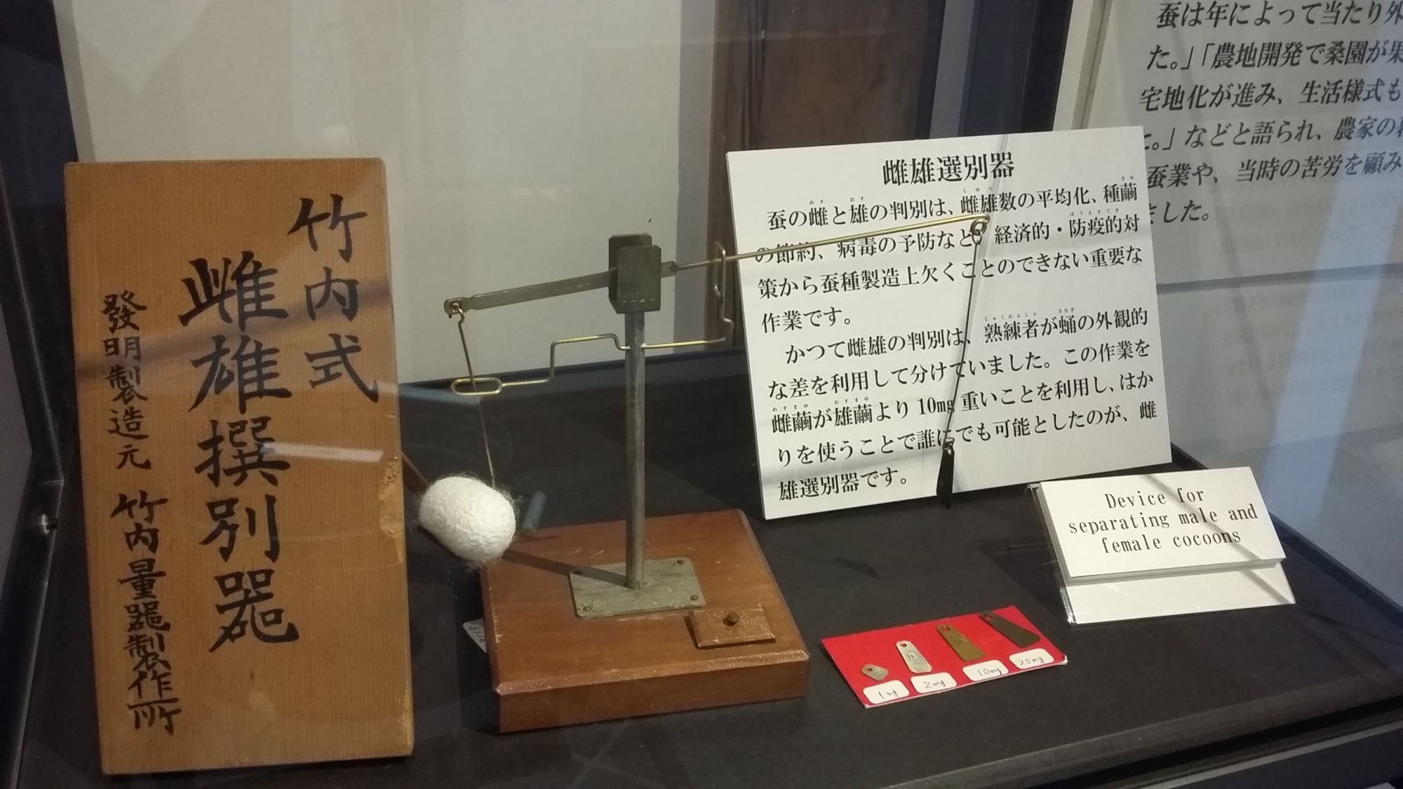 La balance à vers de soie été utilisée pour mesurer le poids des cocons afin de déterminer lesquels étaient mâles et lesquels étaient femelles. Ces instruments de mesures peuvent détecter une très légère différence de poids jusqu’au milligramme. La balance de cocon, mise au point pendant la période Taisho (1912-1926), était un produit populaire auprès des producteurs de soie au Japon. Une occasion de découvrir une partie de l’histoire de la ville!