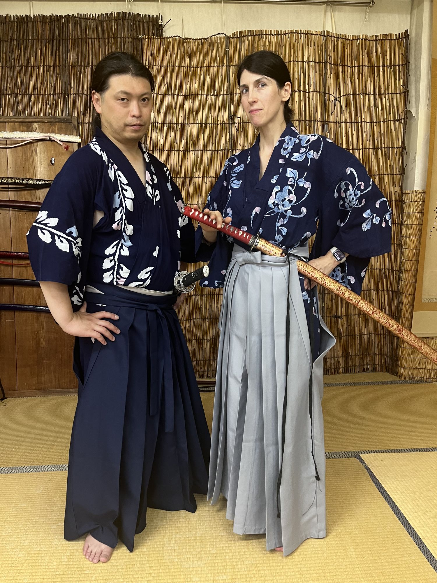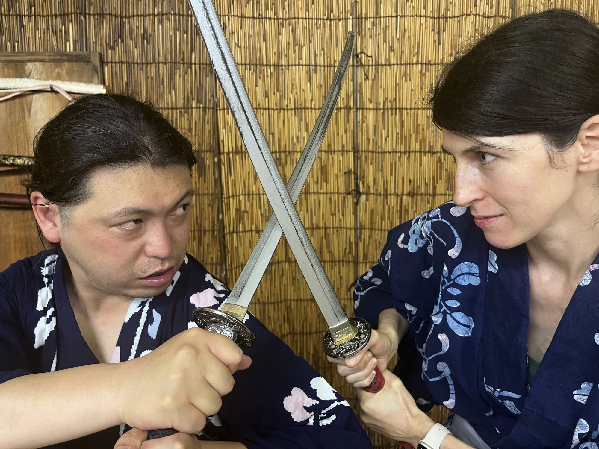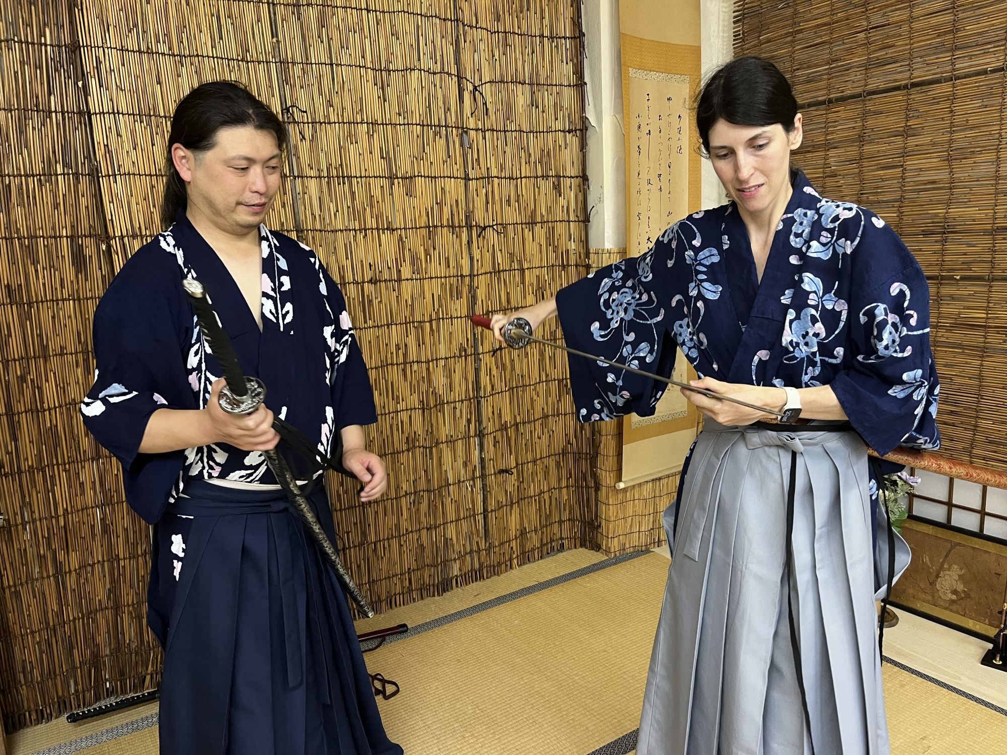 L’un des points forts de l’expérience est la qualité des explications, traduites en français, de notre maître samouraï du jour : Kei-san. On ne se contente pas de brandir un sabre pour la photo : on apprend les gestes de base avec sérieux — comment dégainer (et rengainer !) le katana avec précision, adopter une posture d’attaque correcte, et manier la lame avec respect. Le tout dans une ambiance détendue, mais empreinte de respect pour l’héritage des samouraïs.