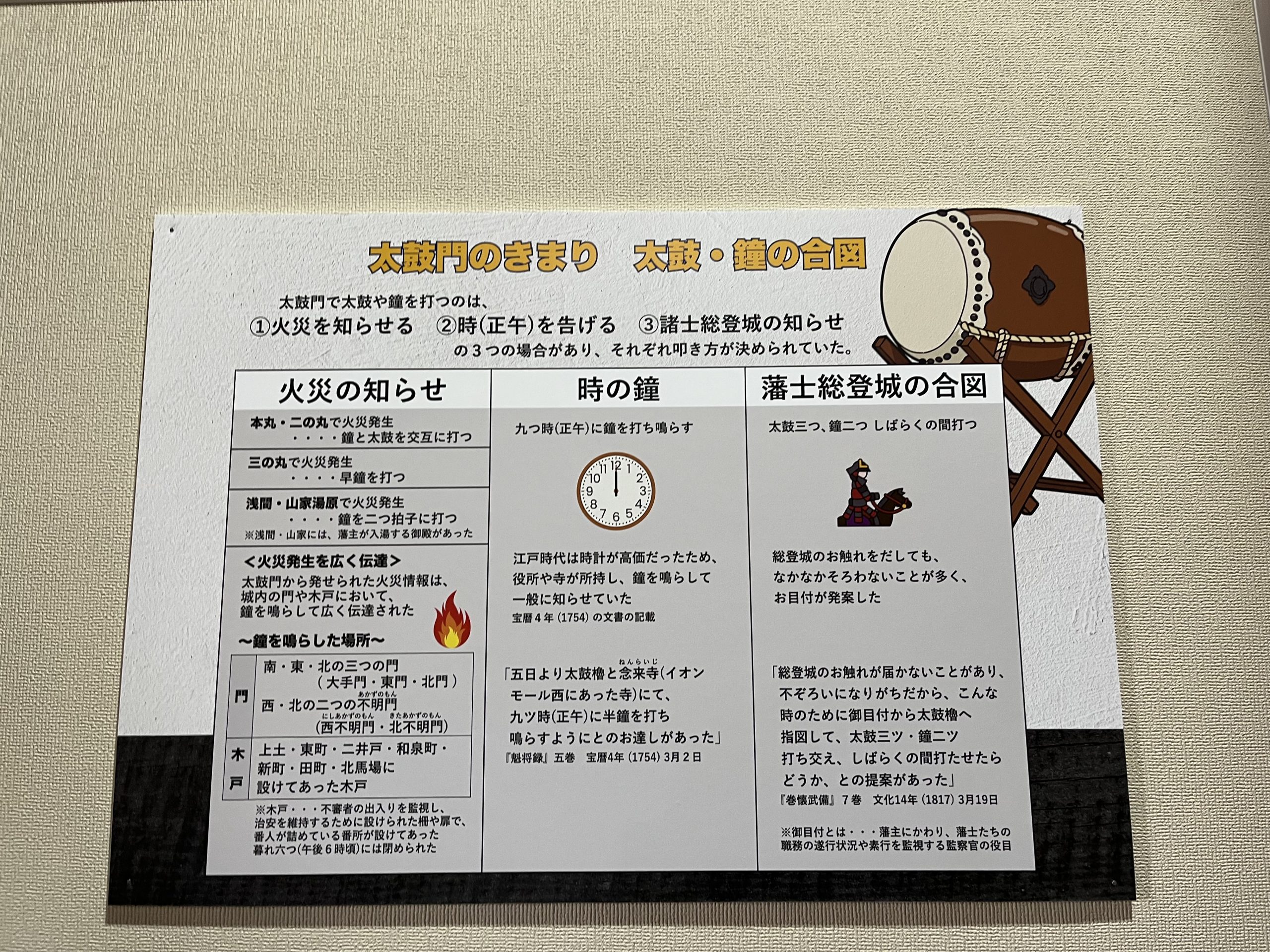 La porte Taikomon, aussi appelée « porte du tambour », tire son nom d’un tambour (taiko) autrefois logé dans la tour supérieure afin de marquer les heures ou alerter en cas d’alerte durant les temps de guerre. Mais son rôle allait bien au-delà d’une simple annonce : cette porte faisait partie d’un dispositif défensif complexe (un masugata), formant un « piège » — un espace avec deux portes successives enfermant les visiteurs potentiels entre des murs, les exposant aux flèches, armes à feu anciennes ou pierres lancées depuis les tours.