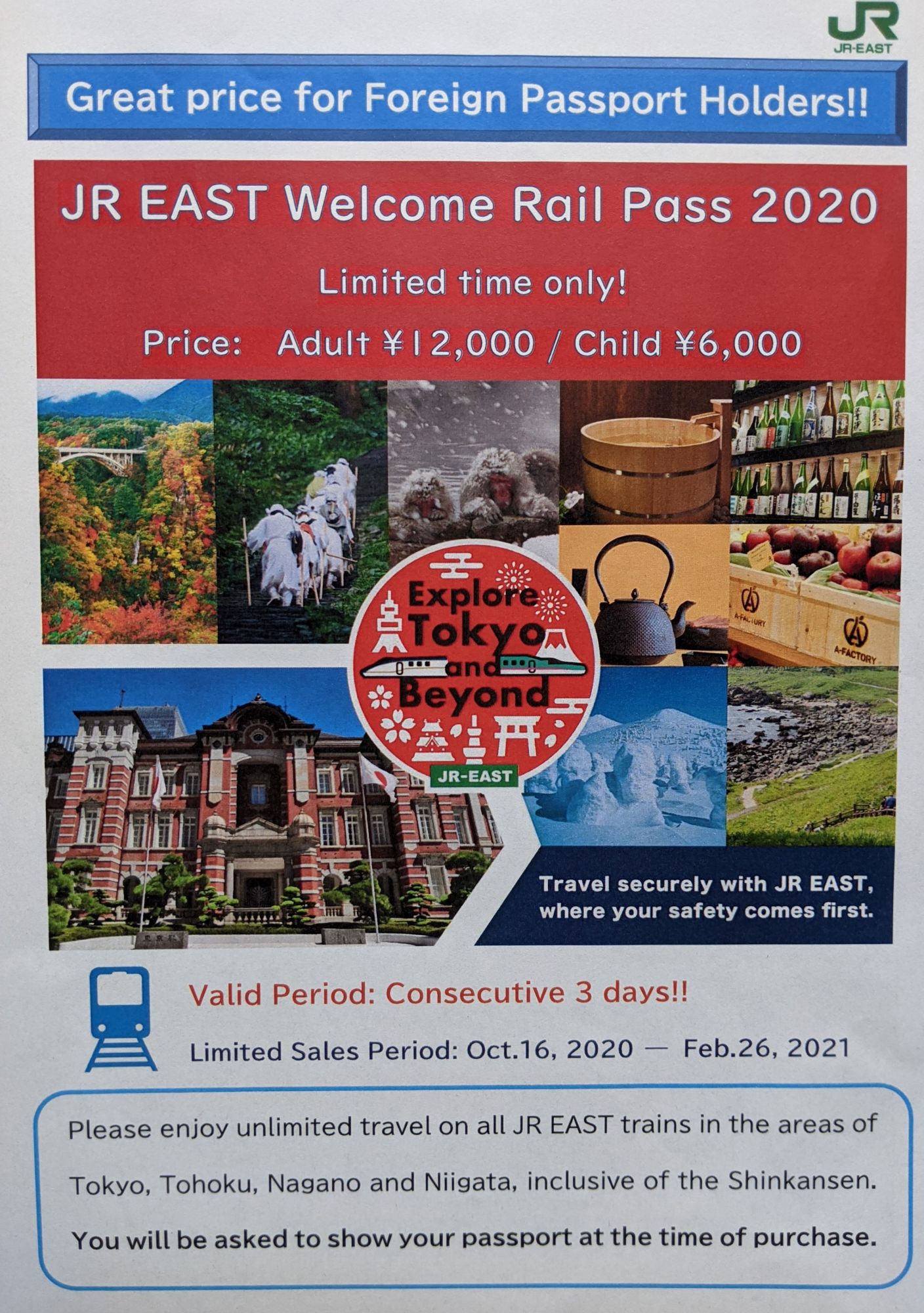 Pour tous les résidents étrangers au Japon, un pass illimité de 3 jours est proposé à seulement 12,000 Yen par adulte et 6,000 Yen par enfant. Valable sur l’ensemble du réseau de la JR East – Shinkansen inclus.